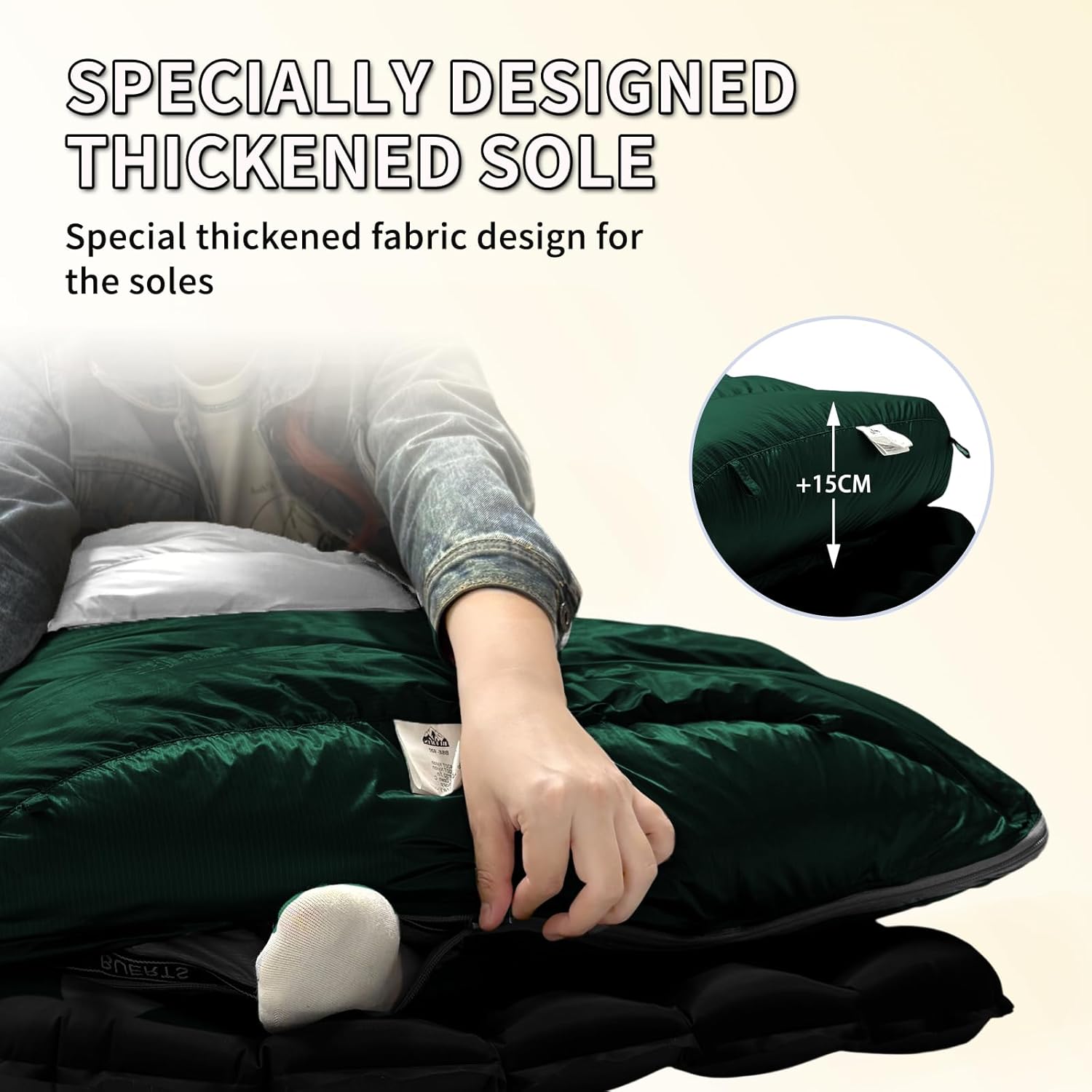【Warmth Design】Combination of envelope sleeping bag and mummy sleeping bag – the upper body of the mummy sleeping bag has narrowed shoulders that fit the body better, locking in warmth and keeping warm better; the lower body of the envelope sleeping bag has ample room for the legs and a separate zipper design at the bottom, so the feet can be exposed for ventilation and walking.