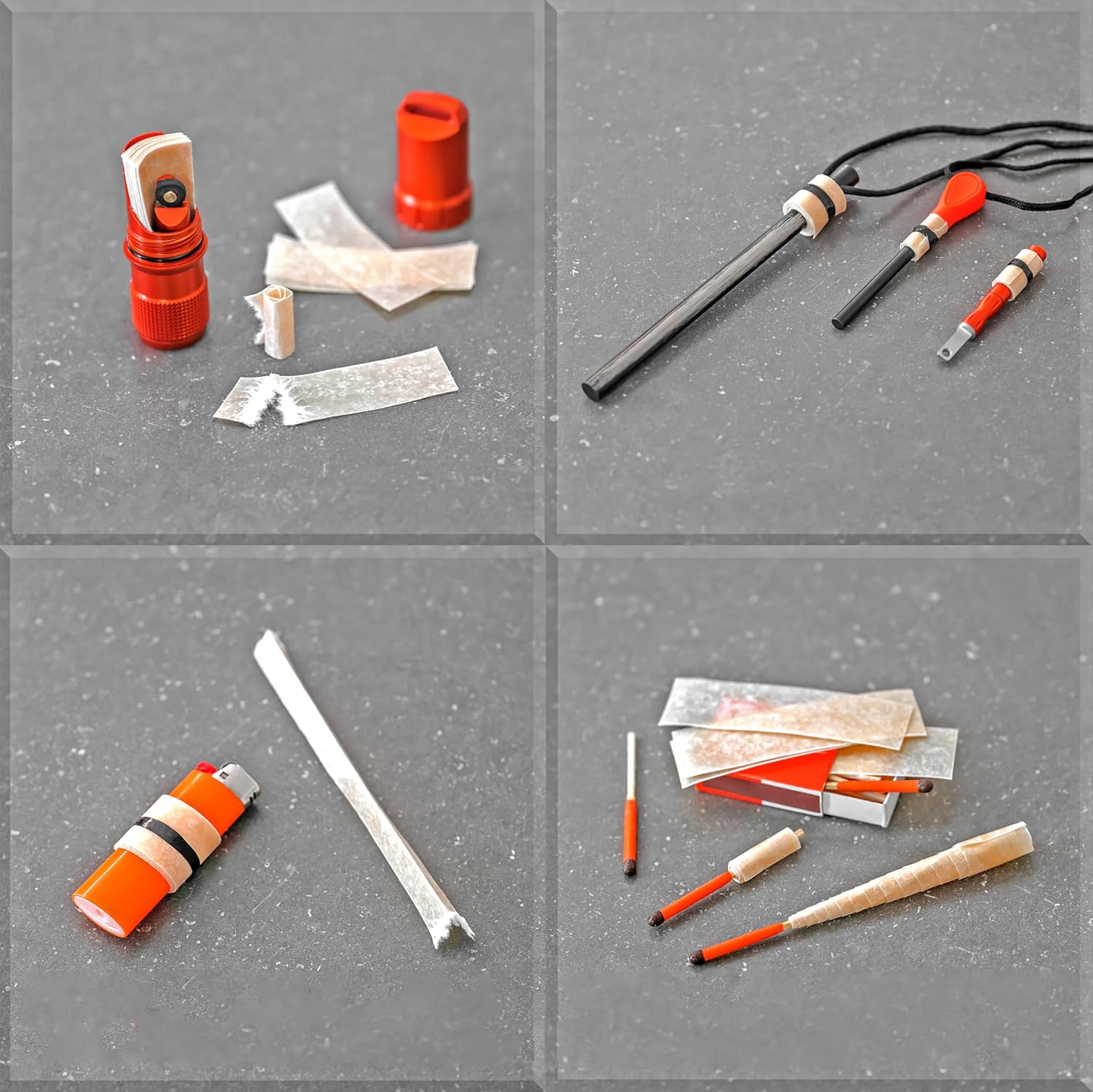 To use, simply tear off a small length of the Fire Strip Roll tinder from the INSIDE of the roll. Work the tinder with your fingers to break up the wax coating. Make small, rough tears to expose the paper fibers. Apply flint spark (or open flame) to fibers. Add additional Fire Strip Roll material and/or other tinder as needed to build larger flame.