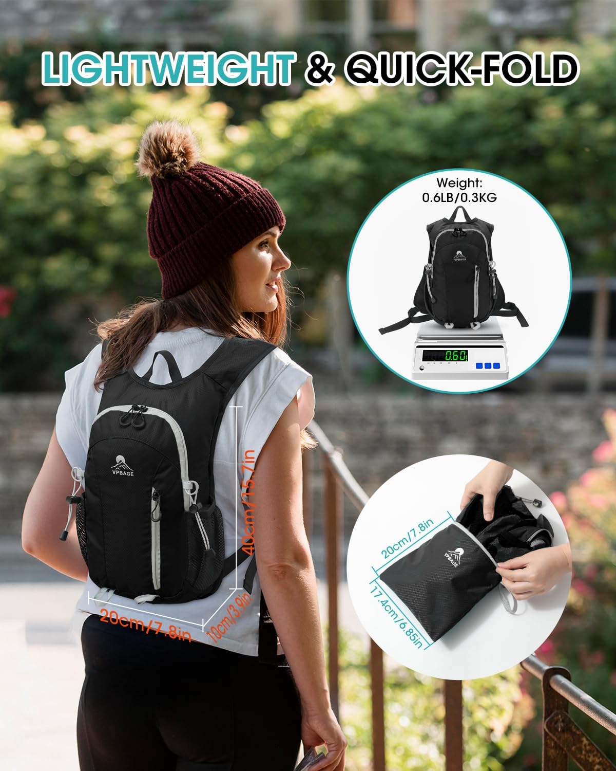 Lightweight and Pressure-relieving – Weighs only 0.6 LB, this collapsible backpack features an ergonomic design that lifts up and evenly distributes weight, reducing strain on shoulders and back by 30%, ensuring hikers traverse challenging terrains with ease.It’s a perfect day packs lightweight for women and men that prioritizes comfort and mobility