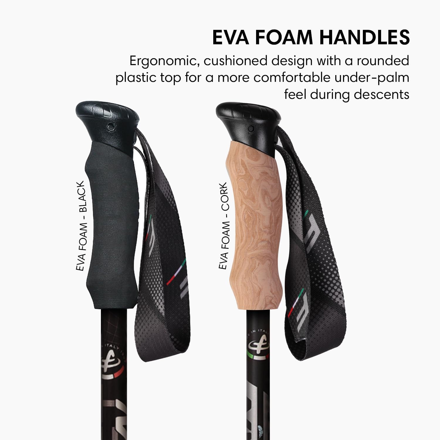 Trusty trekking poles, made in Italy: 7001 aluminum construction and super-strong locking system of fizan’s original compact poles. Cork grip has a new ergonomic design with a rounded plastic top for more comfortable under-palm feel