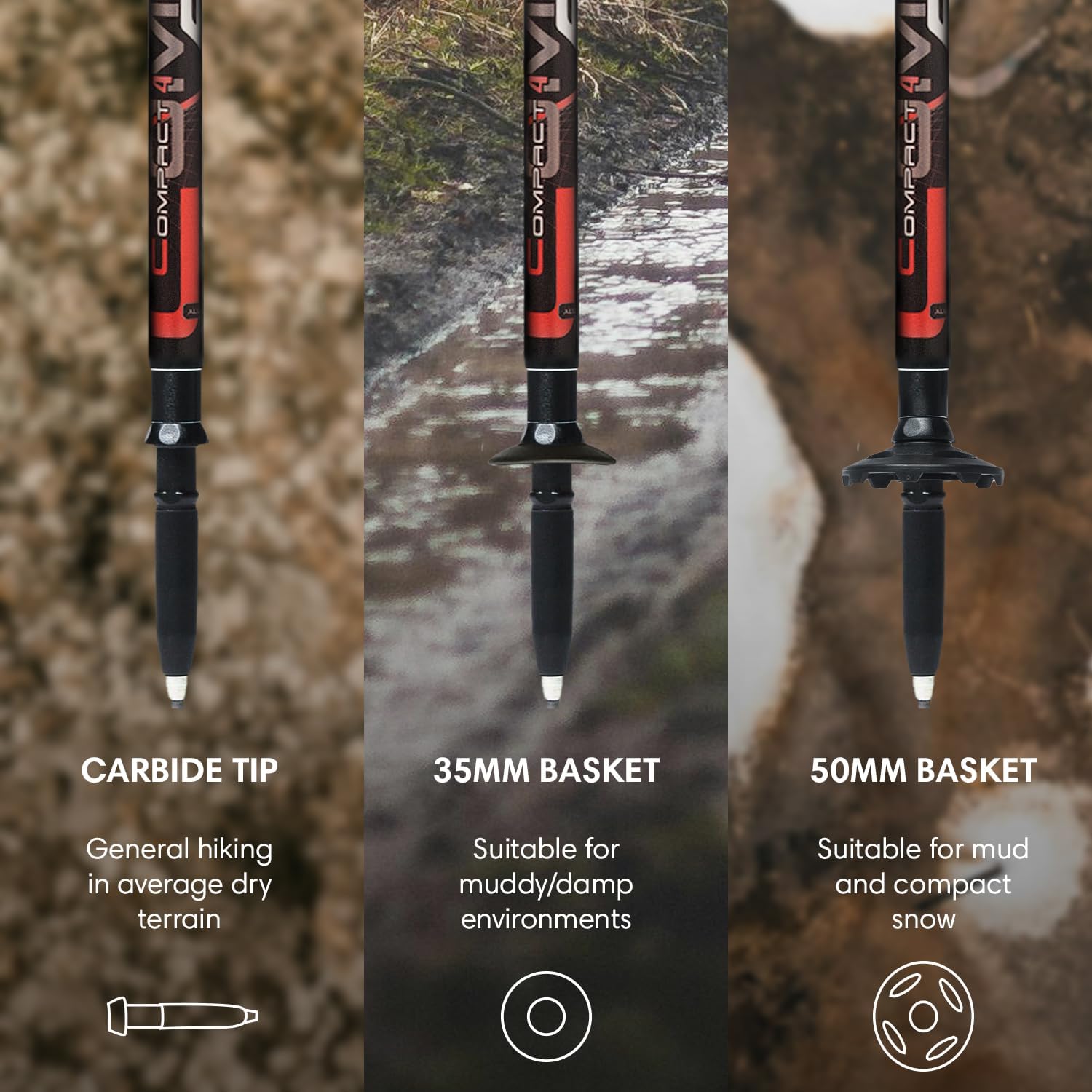 Featuring three sections, the Compact 4 is adjustable from 19 to 49 inches and weighs 6.0 ounces per pole. featuring replaceable carbide tips for traction on dirt trails and metal-reinforced, highly textured rubber tip covers for rocky trails and slippery surfaces. Along with the included baskets, the poles can accommodate press-fit baskets from other brands.