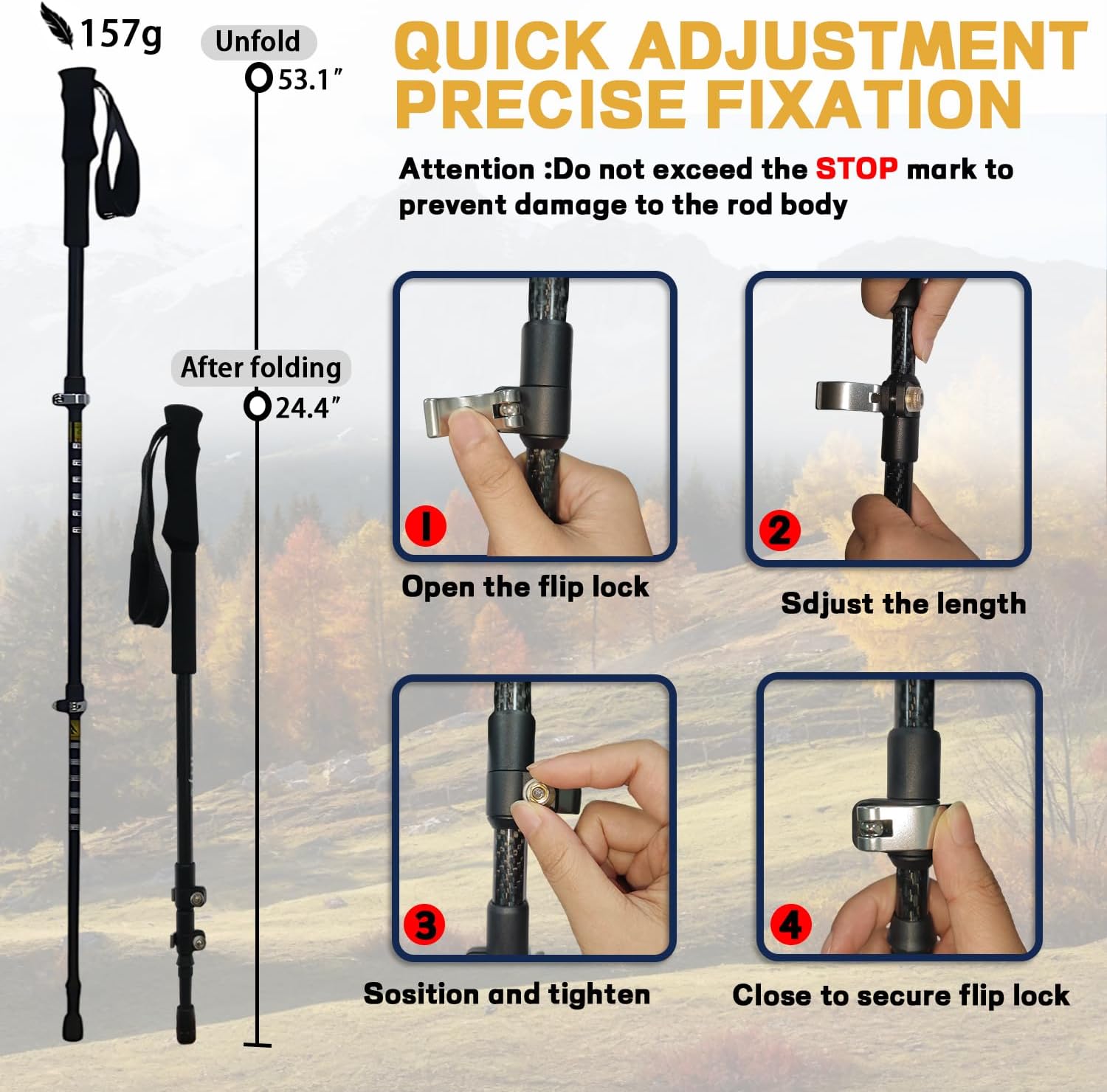 Lightweight and portable: Carbon trekking poles collapsible lightweight only 157g per stick,EVA foam extended grip breathable and sweat-absorbent, nylon adjustable wrist strap reduces arm stress