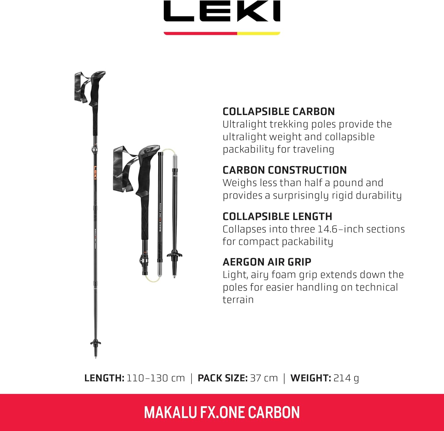 Specs | [Activities] Trekking, Hiking; [Length] 110 cm, 115 cm, 120 cm, 125 cm, 130 cm; [Collapsible Length] 14.6 in; [Weight] (120 cm) 7.5oz; [Shaft Material] Carbon (PRC 1000); [Folding System] ELD; [Basket] Trekking; [Tip] Flex Tip Short Carbide