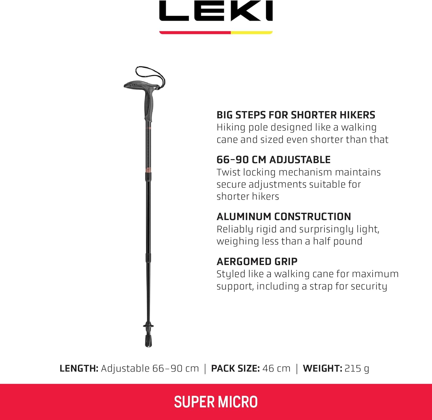 66-90 cm Adjustable | Twist locking mechanism maintains secure adjustments suitable for shorter hikers.