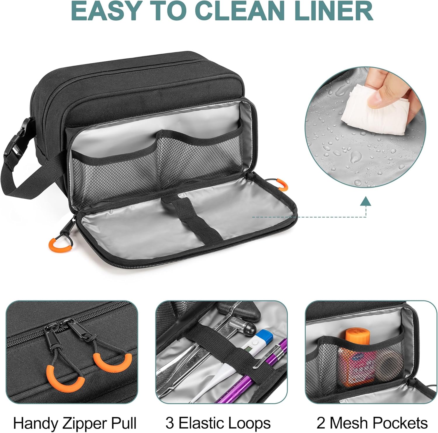 ROBUST POUCH FOR TOOLS: The front compartment is equipped with 2 large mesh pouches and 3 sturdy elastic loops, suitable for medical instruments and tools like scissors and tweezers. The three-sided zipper open pocket can be fully laid flat, allowing the user to reach items from any direction. The thick, water-resistant lining is durable and easy to clean.