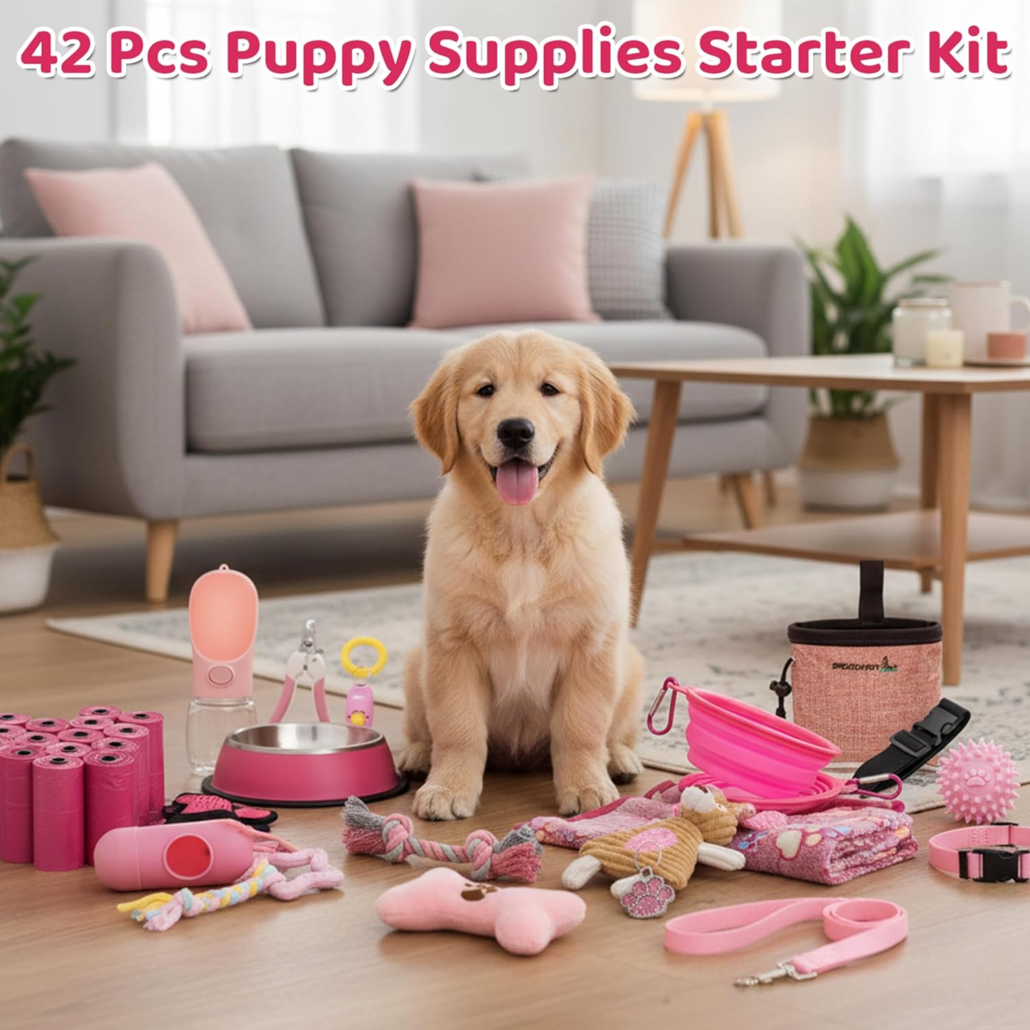 Puppy Starter Kit :dog chew ball toy, plush dog squeaky toys, dog rope toys, dog poop bag dispenser and waste bag, dog treat bag, dog blanket, puppy training clicker, pet grooming glove, pet id tag, dog 3 refills stick roller, nail clipper and nail grinder, brush, water bottle, dog collars and leash. Meet your pet’s daily needs and easily start your pet-raising journey.