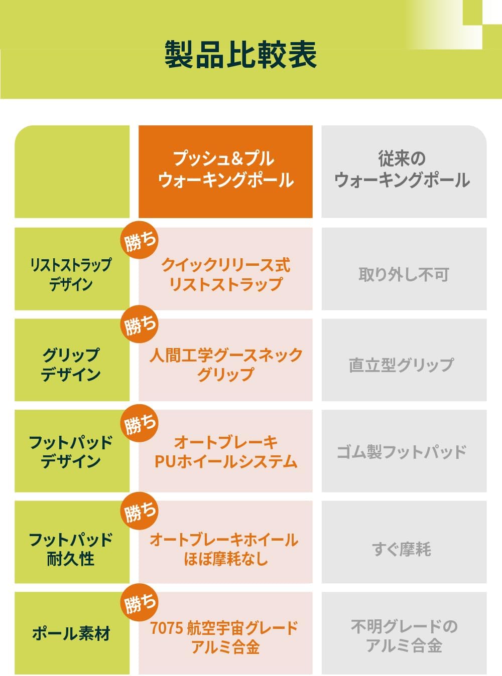 Premium Build & Patented Design – Ergonomic gooseneck grip for wrist comfort, quick-release wrist strap, aerospace-grade 7075 aluminum shaft, and worldwide patented AutoBrake PU wheel system.
