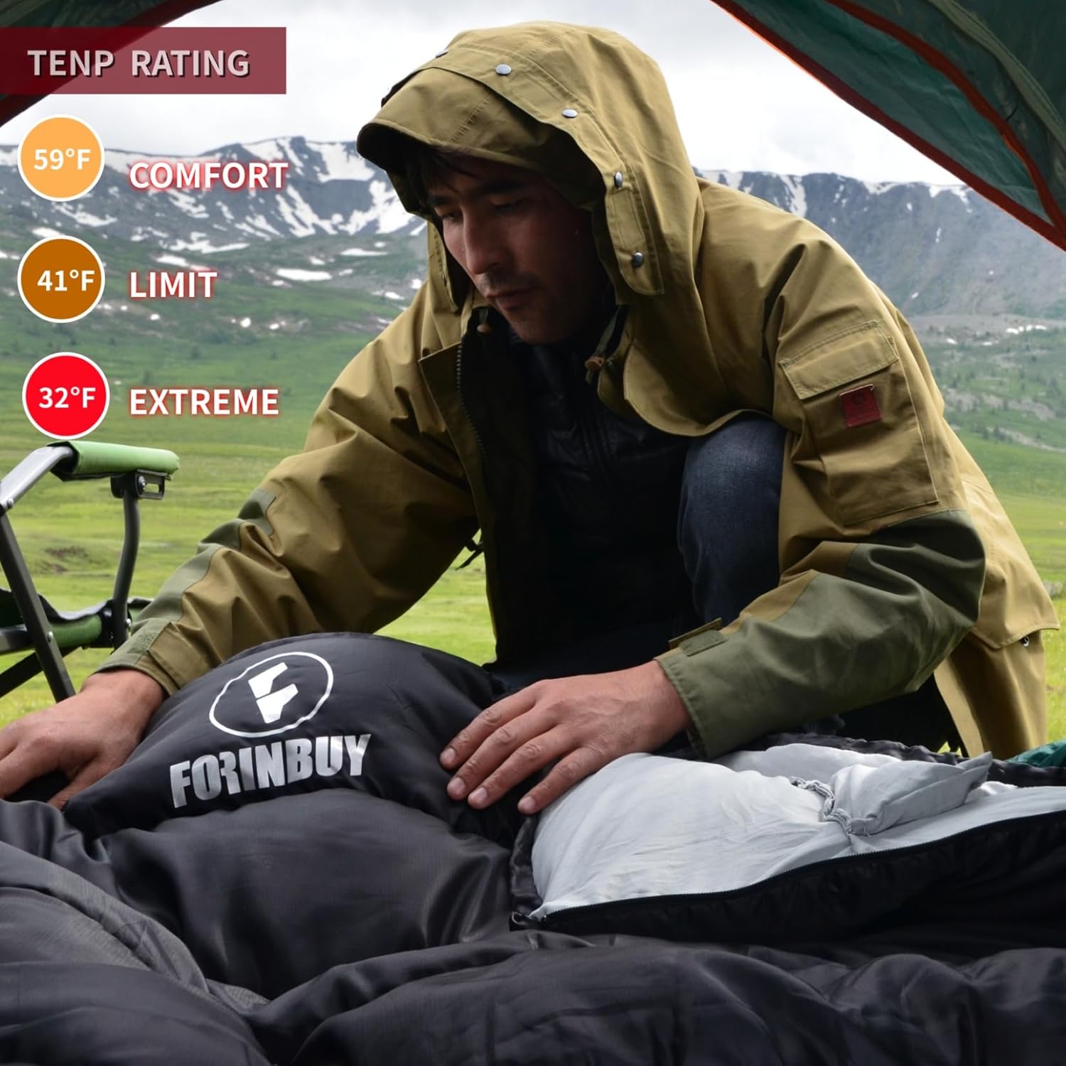 【SUPER HUGE SIZE】– Economically and practically efficient; with an impressive 90 X 59 inches (230x150cm) size, this camping double sleeping bag can hold 2 people (maximum body type: 5.9ft, 180lbs). Sufficient space, providing ideal conditions for sharing warm time. For couples or family who want to go camping together, FORINBUY two person sleeping bags is a nice a nice option. Also the imitation cotton liner is especially friendly to skin sensitive user .