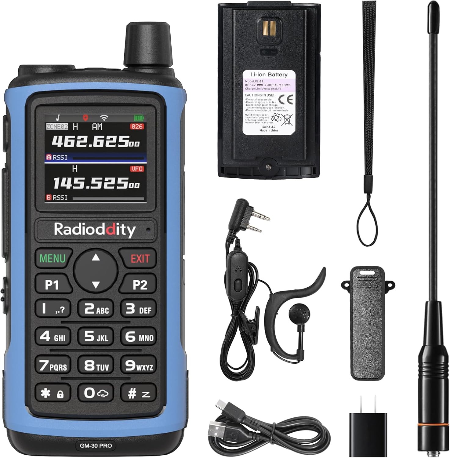 Frequency (TX & RX) GMRS Frequency (RX) FM, Airband (VFO-Only), UHF, VHF, 1.25M (VFO-Only), 1M (VFO-Only), NOAA GMRS Default Channels 30 (CH1-CH30) Channel Capacity 1000 (30 GMRS Channels, 970 Customizable Channels) Output Power Max 5W Power Supply 7.4V 2500mAh Li-ion Battery (Model: PL-19) APP Compatibility Radio Frequency Programmer / Walkie-Talkie Tool (iOS & Android) Accessories Jack 2-pin Kenwood Jack Channel Spacing 25.0 KHz/12.5 KHz ANT Impedance 50Ω Dimensions 5.6 x 2.5 x 1.6 in Weight 10.5oz (with Li-on battery) What’s in the box? 1 x GM-30 PRO GMRS Radio, 1 x Li-ion Battery(with one screw), 1 x ANT, 1 x Headset, 1 x Belt Clip, 1 x Wrist Strap, 1 x USB-C Charging Cable, 1 x Adapter, 1 x User Manual