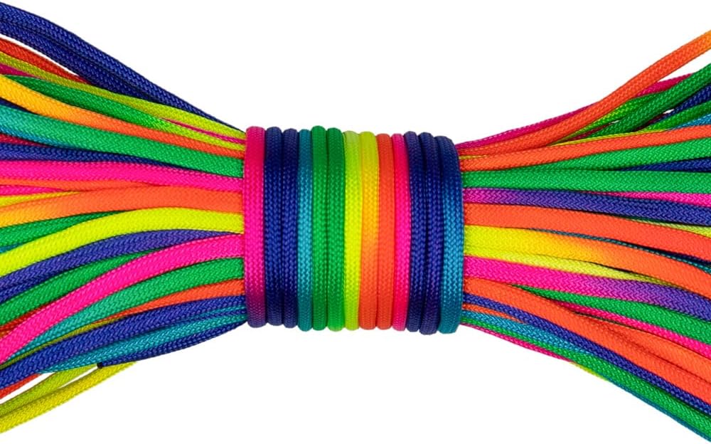550LB 7-STRAND INNER CORE TYPE III PARACORD. You get 100 Feet of Commercial-Grade Rainbow Paracord wrapped in Hank with a Carabiner and Four Contoured Buckles
