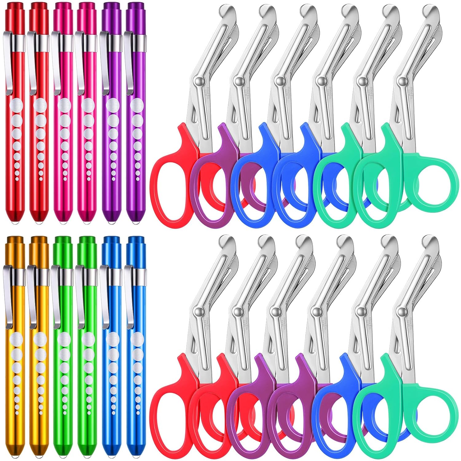 Colorful Nursing Supplies Kit: you will receive a total of 12 nurse shears in red, orange, yellow, green, blue, purple, and 12 LED pen lights (AAA batteries not included) in red, green, purple, blue, black, and pink, 2 per colors, enough quantity and colors to meet your daily work use and replacement demands