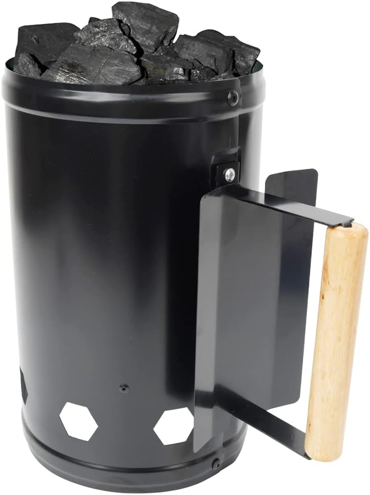 Superior air circulation for evenly burning charcoal that guarantees evenly cooked food. Side holes ensure that air circulates through all the charcoal for even burning. Bottom holes pull the air from outside & draw it up through the chimney starter