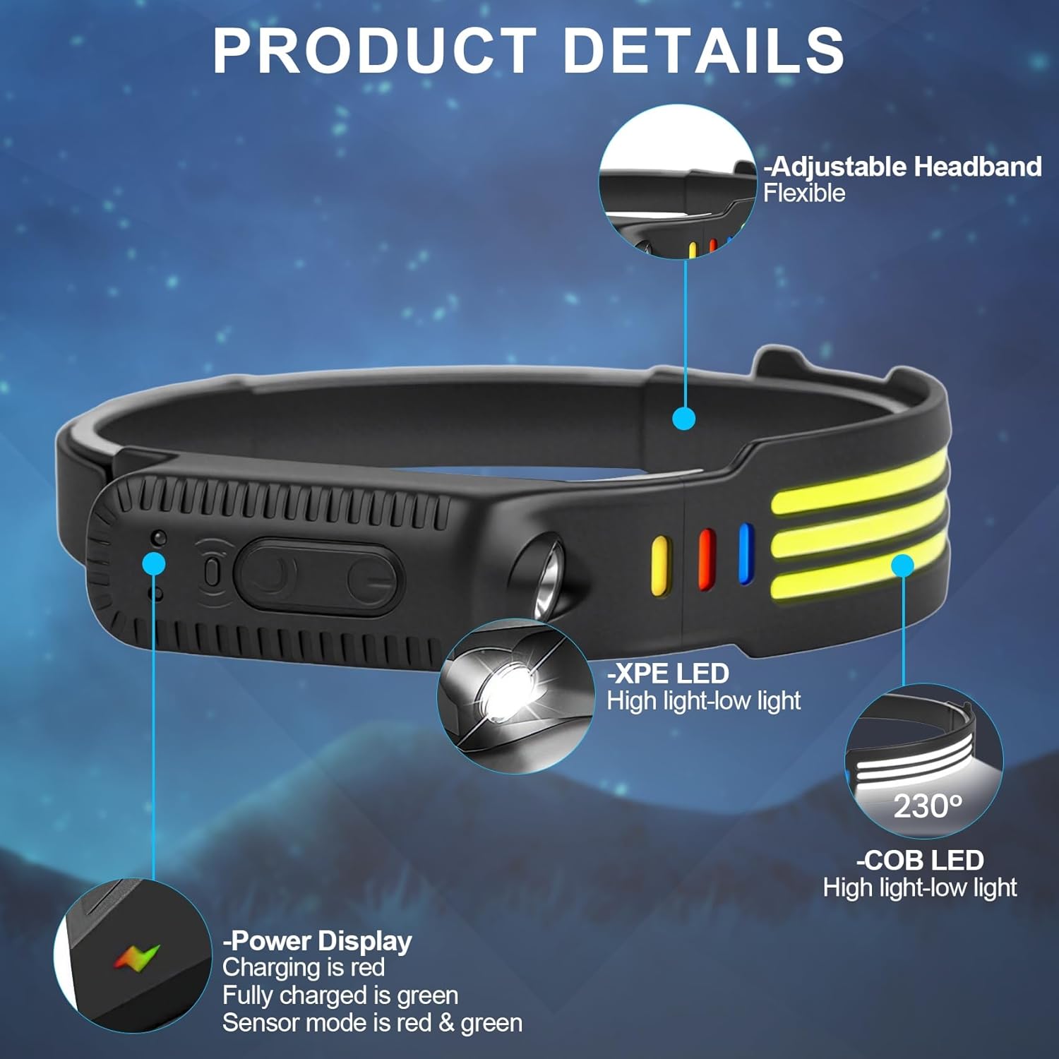Smart Control, 5 Modes & Motion Sensing: This versatile headlamp is equipped with 5 lighting modes① 5 One-Touch Modes: Instantly switch between COB Light (High/Medium), XPE Spotlight (High/Medium), and COB Strobe (activated by a 2-second long press). ② Hands-Free Control: Wave your hand within 10 cm of the sensor to easily turn the lights ON or OFF, thanks to 4 built-in motion sensing modes.