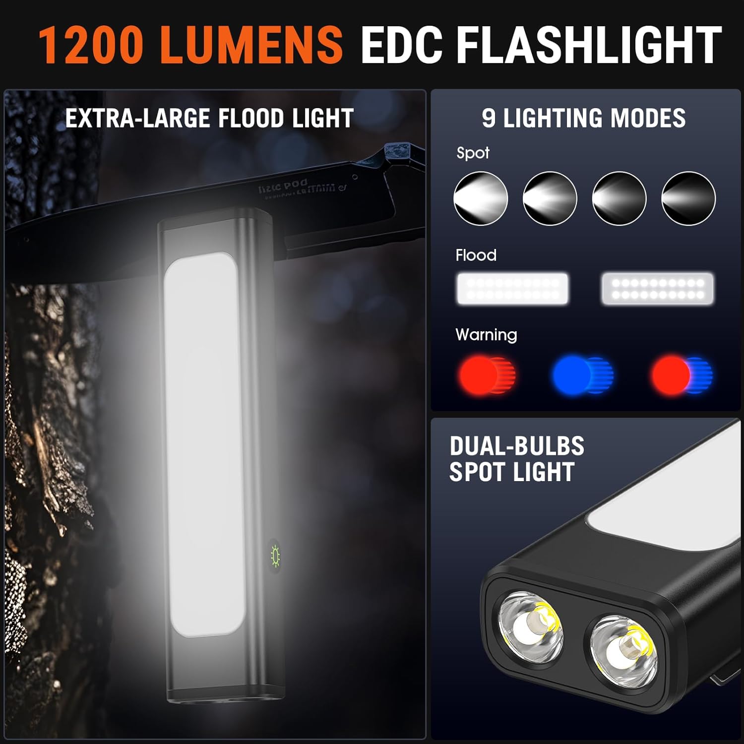 【1200 Lumens Max & 9 Modes】Switch instantly between 4 spotlight, 2 COB floodlight, and 3 hidden warning modes to meet all lighting needs. With up to 1200 lumens of powerful brightness in a compact design, it’s your reliable companion for camping, repairs, and unexpected power outages