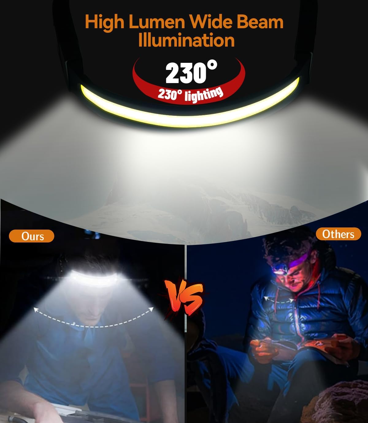 230° WIDE BEAM HEADLAMP : The new wide beam headlamp can illuminate a large wide area of 230 degrees, allows you to illuminate the viewing area without moving your head. Unlike other headlamps only can illuminate 60°, it has a better view to see your around.