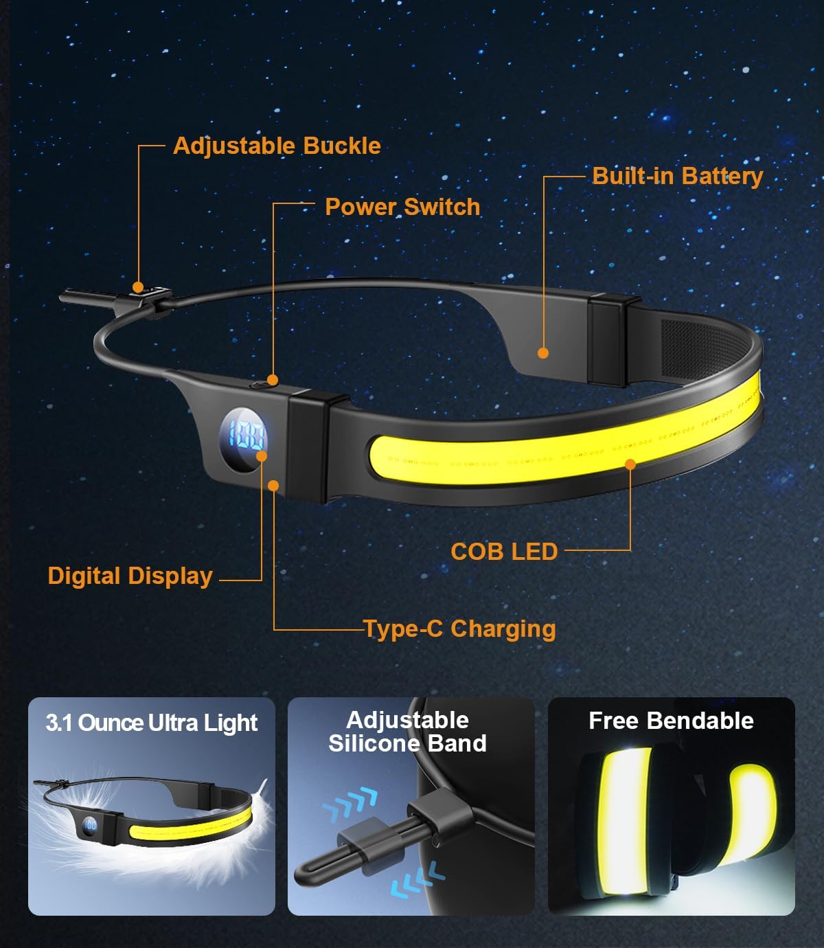 Lightweight & Flexible Silicone Band : 3.1 ounce head light, and headband is made of flexible silicone material, more comfortable to wear than elastic headband. The headband adjusts to the most comfortable size with a sliding buckle.