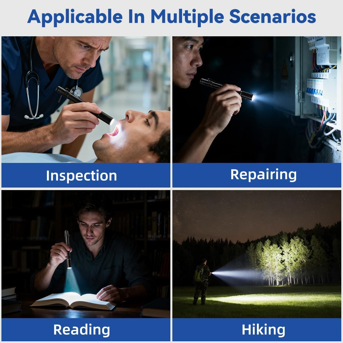 5 Light Modes: Pen flashlight features 5 lighting modes (High/Medium/Low/SOS/Strobe) to handle any situation. High mode delivers intense brightness for demanding tasks, while Medium and Low modes extend battery life for everyday use. The dedicated SOS and Strobe modes provide critical signaling in emergencies. Effortlessly cycle through all options with a single button for ultimate convenience and control