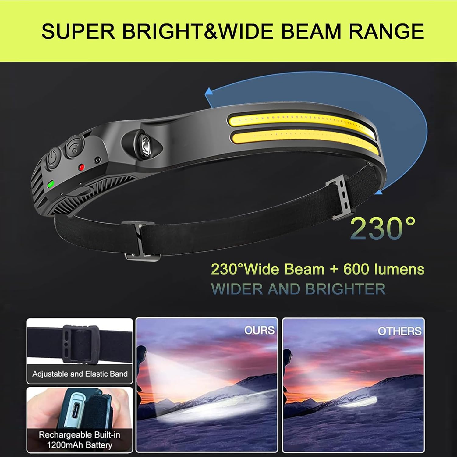 【Super Brightness & Dual Led Strip Design】Our new upgraded 3.0 headlamp features a dual LED strip design, providing twice the lumens of a single LED strip. The rechargeable headlamp offers a 230° wide range, better illuminating your surroundings than standard car headlights. The upgraded 1000-lumen LEDs deliver a spotlight beam distance of up to 150 meters. Confidently navigate through the dark and instantly brighten your surroundings with this powerful illumination