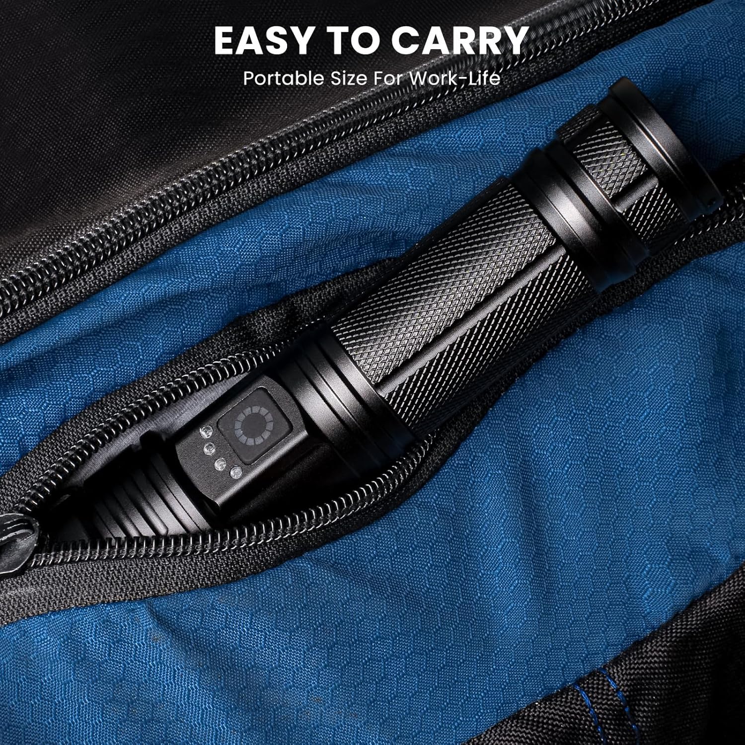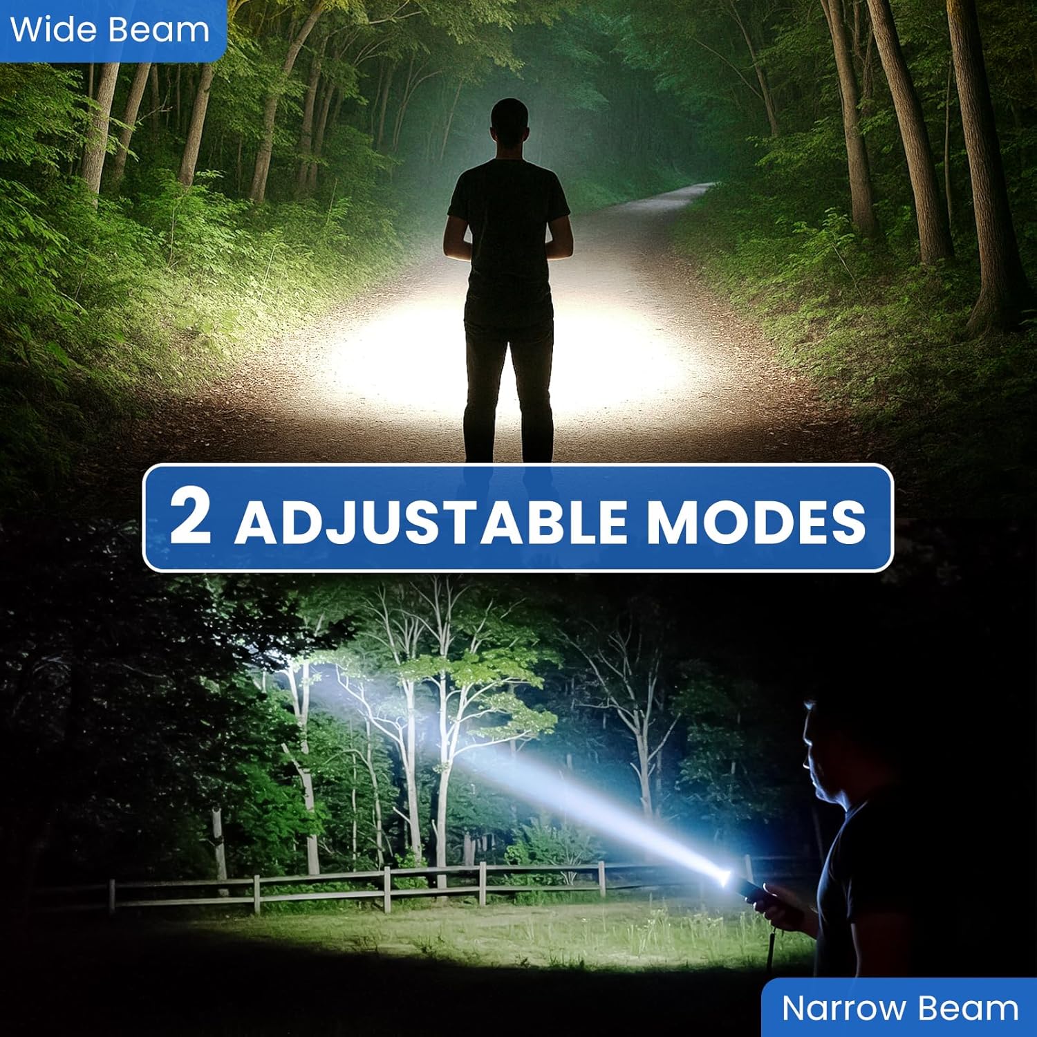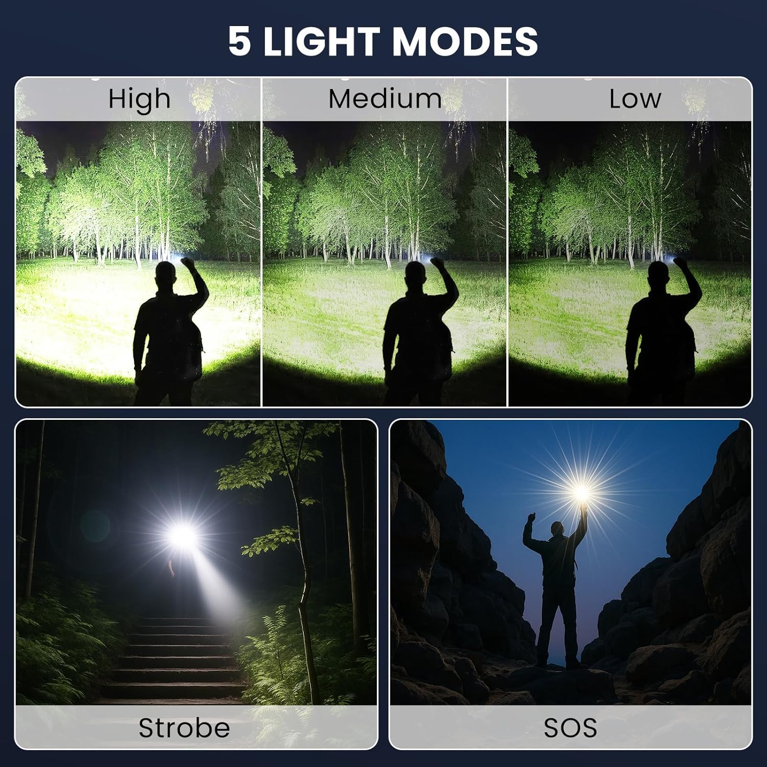 【More Diverse Beam Patterns】The powerful flashlight has High/Medium/Low/Strobe/SOS modes for every scenario. Switch effortlessly with a simple click and enjoy the instant 2-second long-press off function. By adjusting the beam, you can switch from a focused light for distant objects to a wide beam for broader illumination.