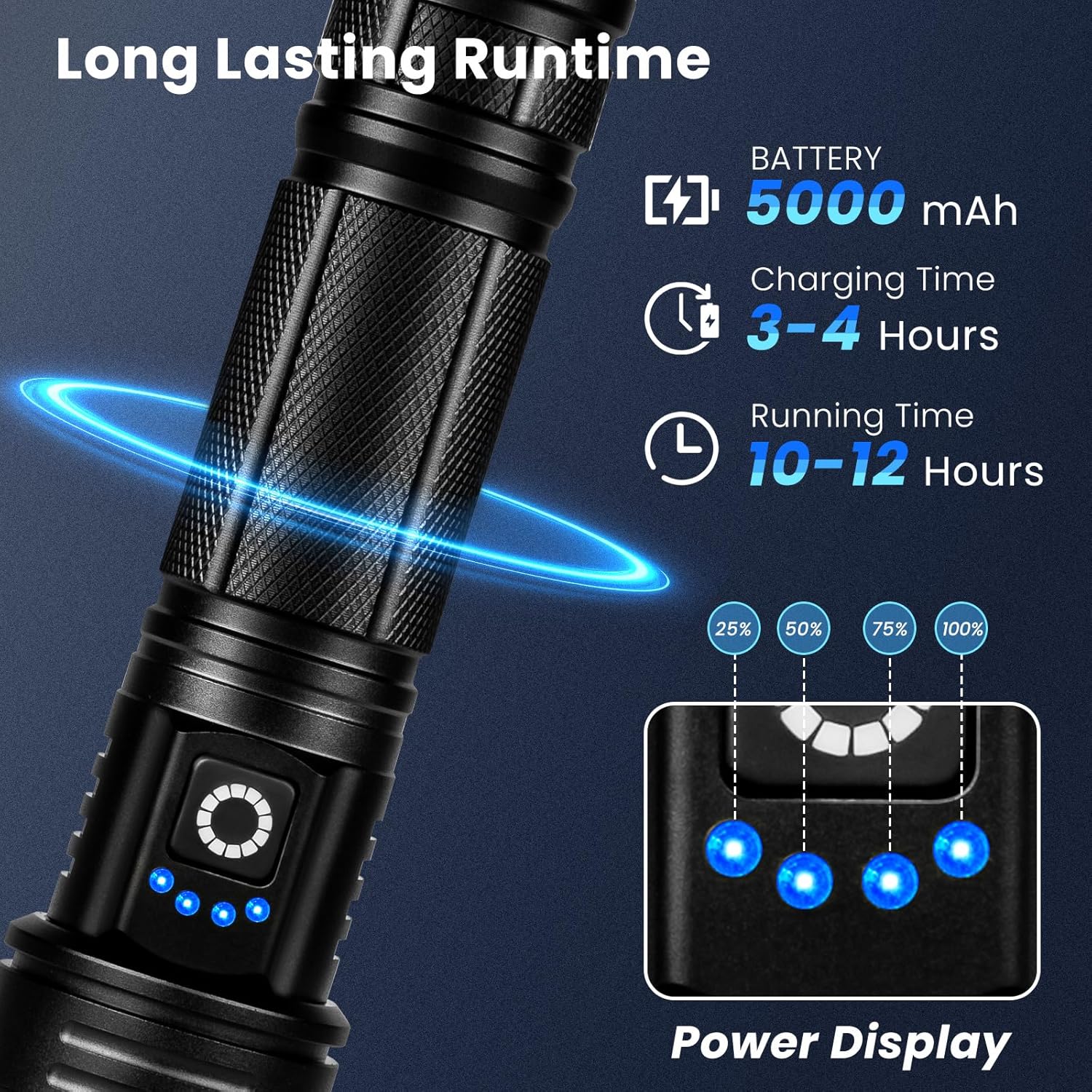 【12 Hours of Non-Stop Illumination】Rechargeable flashlights are built with fast-charging tech, delivering 12+ hours of runtime on a single charge! The 4-level power indicator (25%/50%/75%/100%) keeps you updated in real time. Whether you’re hiking, camping, or navigating a power outage, TIMSUMR flashlights high lumens outlast the competition