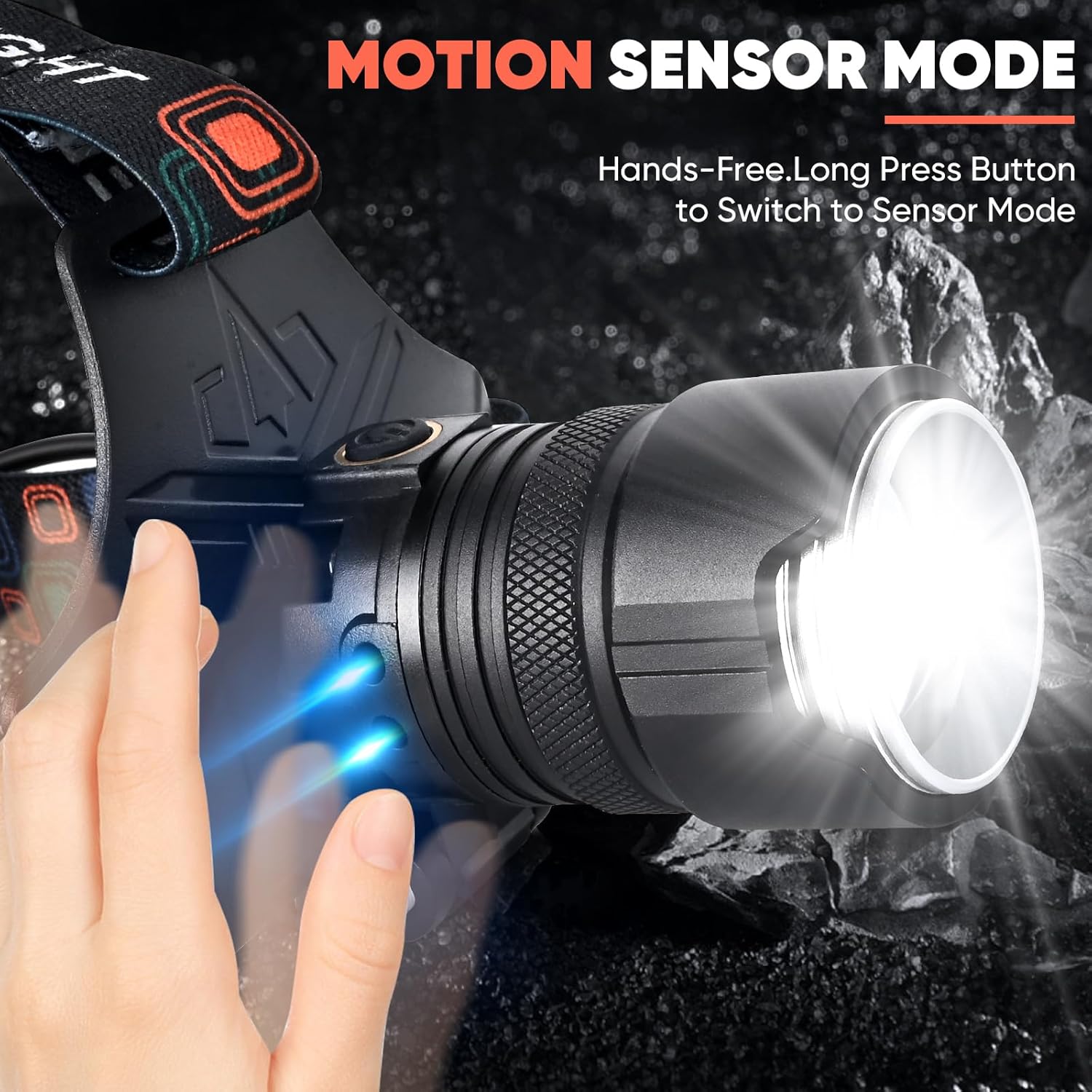 🤖【Smart Motion Sensor】Activate with a 3-second press, then wave to switch modes or power on/off—perfect for hard hat light users, gloved hands, or heavy lifting. No complicated operations required, free your hands.A must-have for headlamps for adults needing quick, reliable operation in rain or rugged terrain.