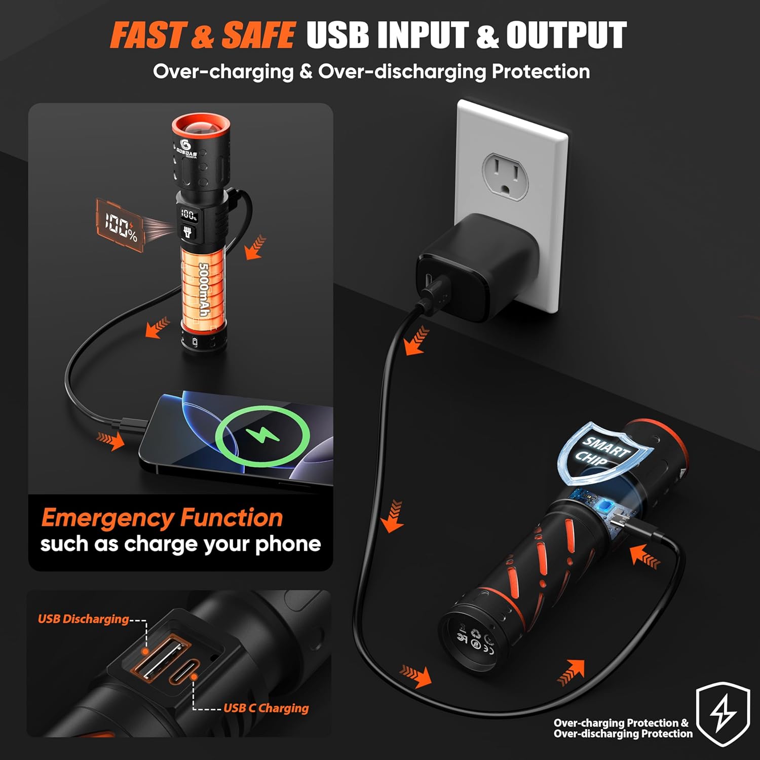[ Long Lasting – 12 Hours & USB Output Function & LCD Power Display ] The heavy duty flashlight USB C is equipped with 1pcs 5000mAh rechargeable battery, so it can provide up to 12 hours of bright and non-diminishing brightness. By connecting the USB A interface, the flashlight can be used as a power bank such as to charge your phone for emergency. The LCD power display shows remaining power accurately in percentage numbers. So that you will get known when to charge it in advance, no worry of power off.