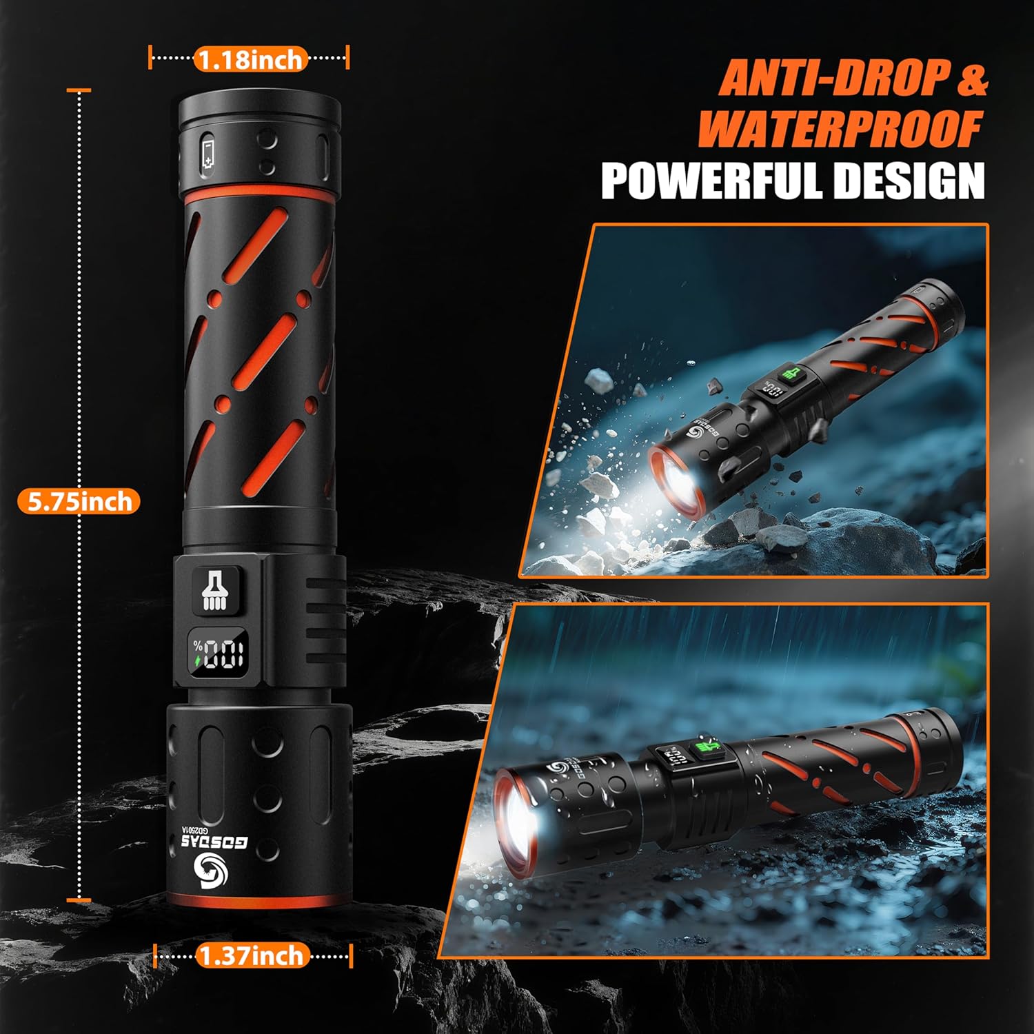 [ 2025 Super Bright 30W LED – Brightest 10000 Lumens ] What we provide is a upgraded 30W LED ultra bright flashlight high lumens ,the highest brightness would be 10000 Lumens, meaning it can easily illuminate a whole room of 500㎡ or a backyard. It is bright enough for night work or home power failure.