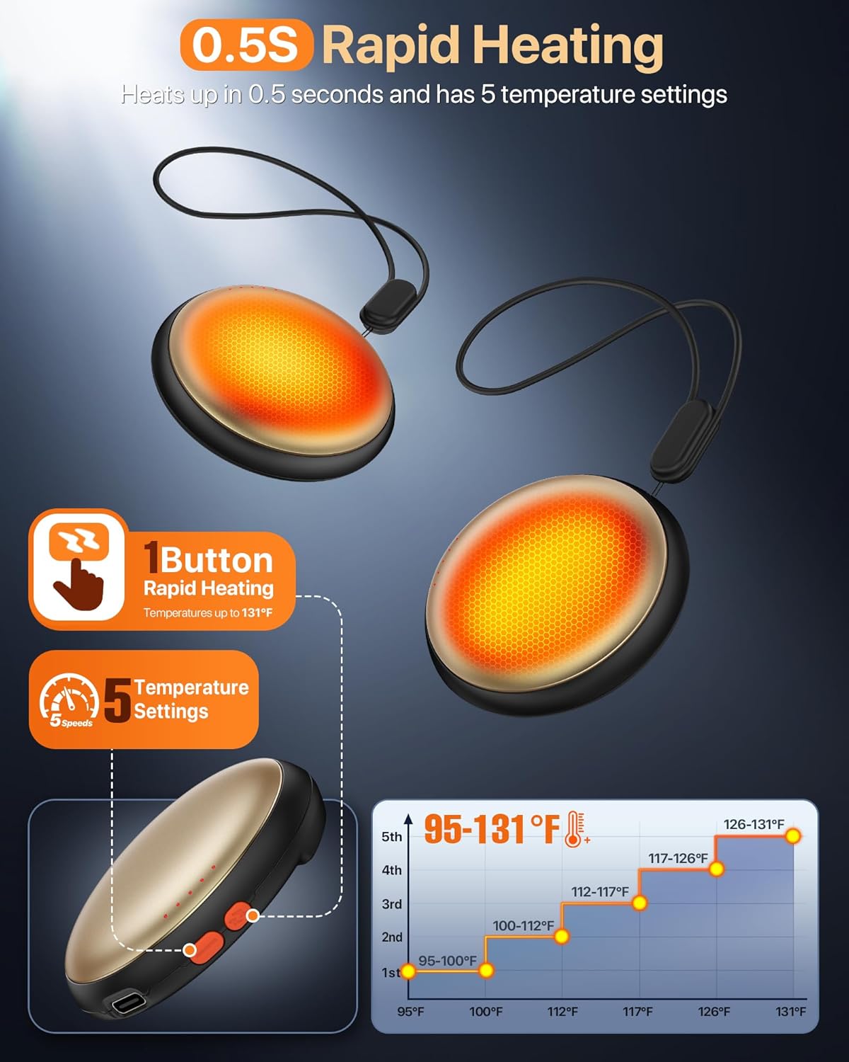 Heats up instantly in 0.5 seconds: one-button design activates in 0.5 seconds, instantly warms up to 131℉, fastest warmth to palms. Choose from 5 levels heating for your comfort.