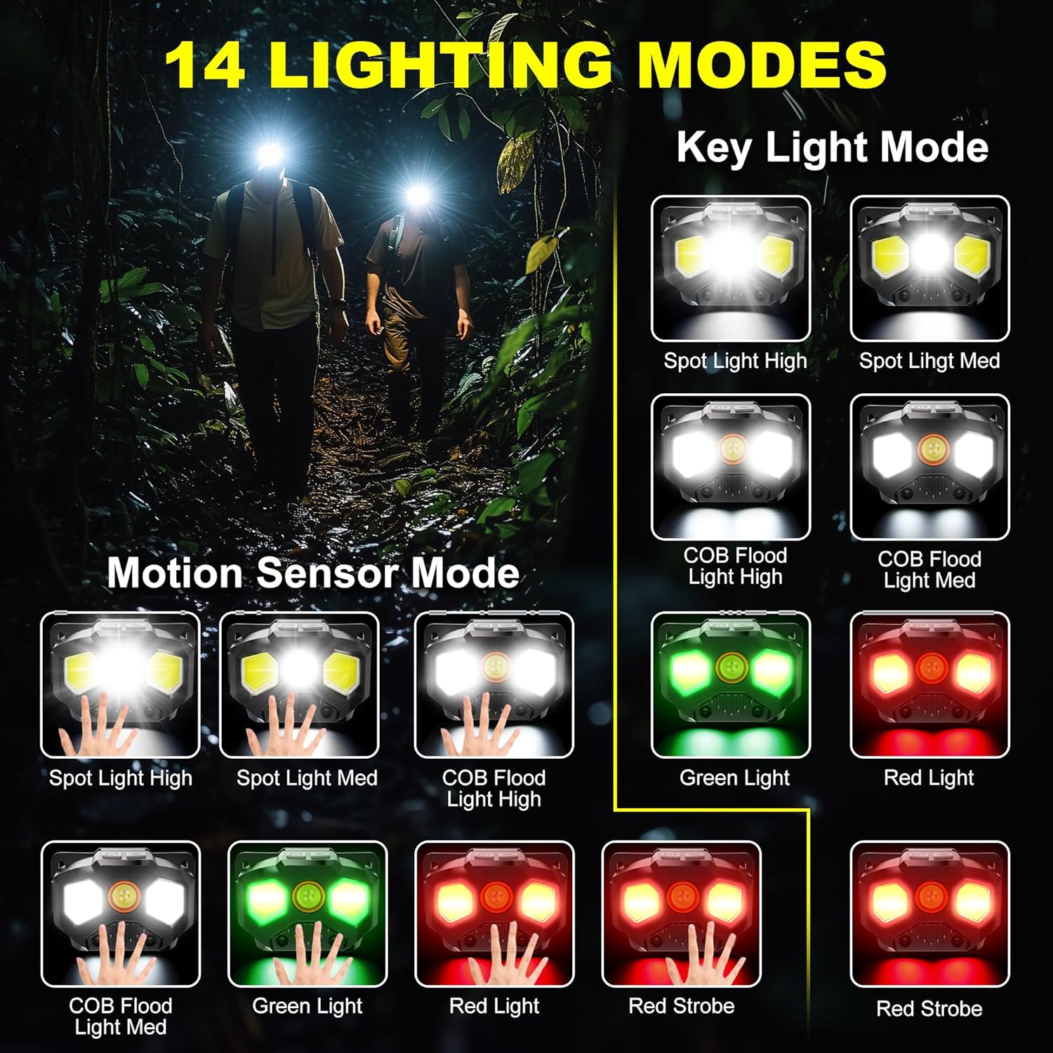 【14 Lighting Modes】This headlamp with red light boasts 14 different lighting modes to meet all your needs. ①In key light mode, you can easily switch between spot light (high mode-up to 3.5hours med mode-up to 8 hours), COB flood light(high mode-up to 5.5 hours, med mode-up to 8 hours), green light-up to 5 hours, red light(stay on-up to 3.5 hours, red strobe-up to 6.5 hours). ②In motion sensor mode, it provides the same 7 lighting modes for your convenience.