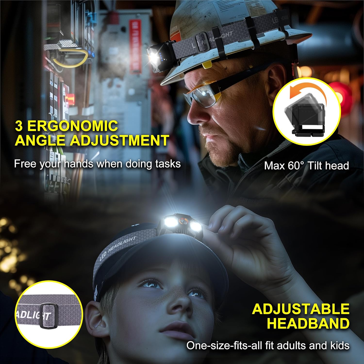 【3 Ergonomic Angle Adjustment】Featured with ergonomic adjustable angle, our premium versatile headband light headlamps allows you to adjust the angle as you need, without straining or craning your neck. You can direct light precisely with 3 adjustable angles(30°,45°,60°). It will be tightly fixed to avoid shaking and sliding when running, working. Make it your top choice for camping, running, and hiking.