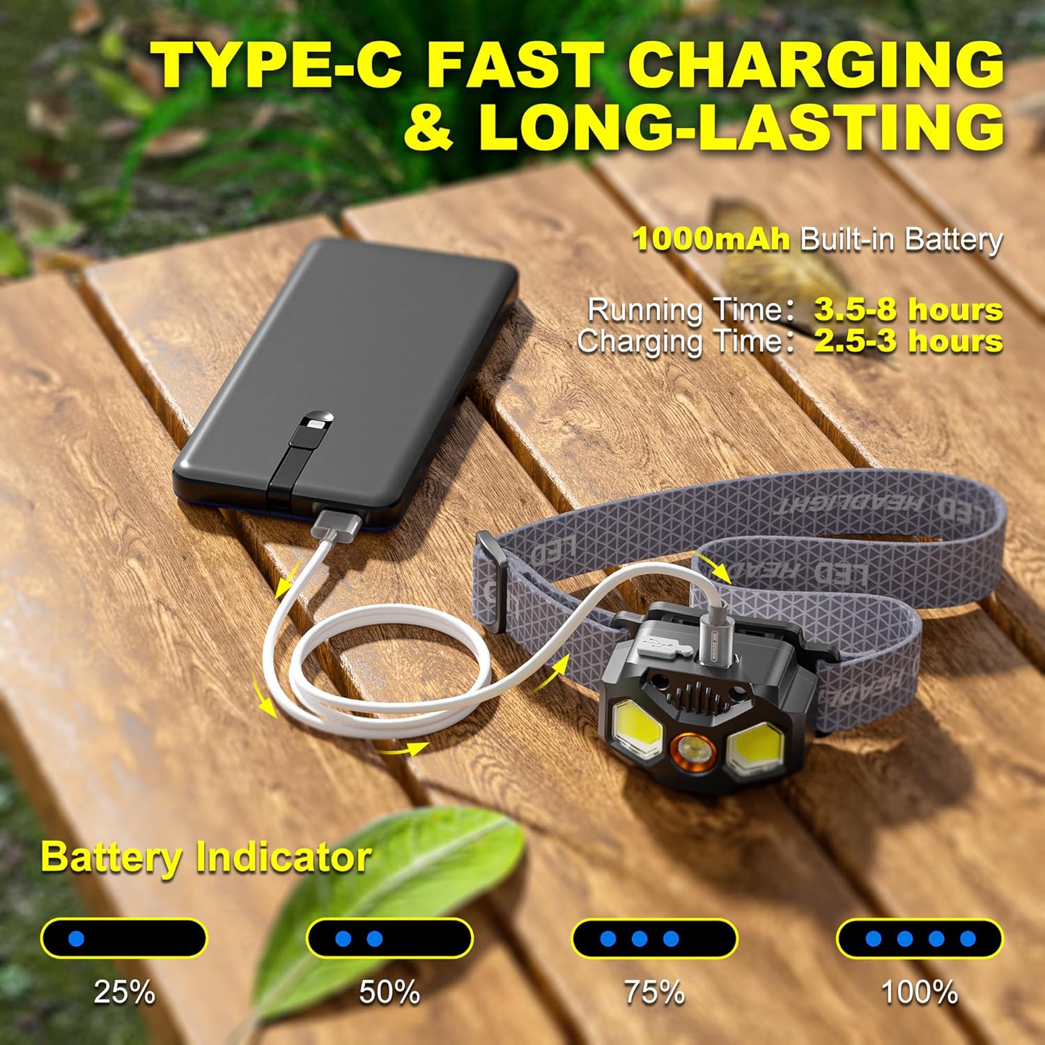 【Fast Type-C Rechargeable & Long Lasting】Favorlite led headlamp features an upgraded Type-C fast charging that only takes around 2.5-3 hours to be fully charged. Built in powerful 1000mAh rechargeable battery, max runtime of this camping headlamp is 8 hours, exceeding 98% of similar products on the market and making it the perfect work headlamp. No need to replace the battery, reducing D/C/AA/AAA dry battery waste! And the battery indicator will help you master battery usage.
