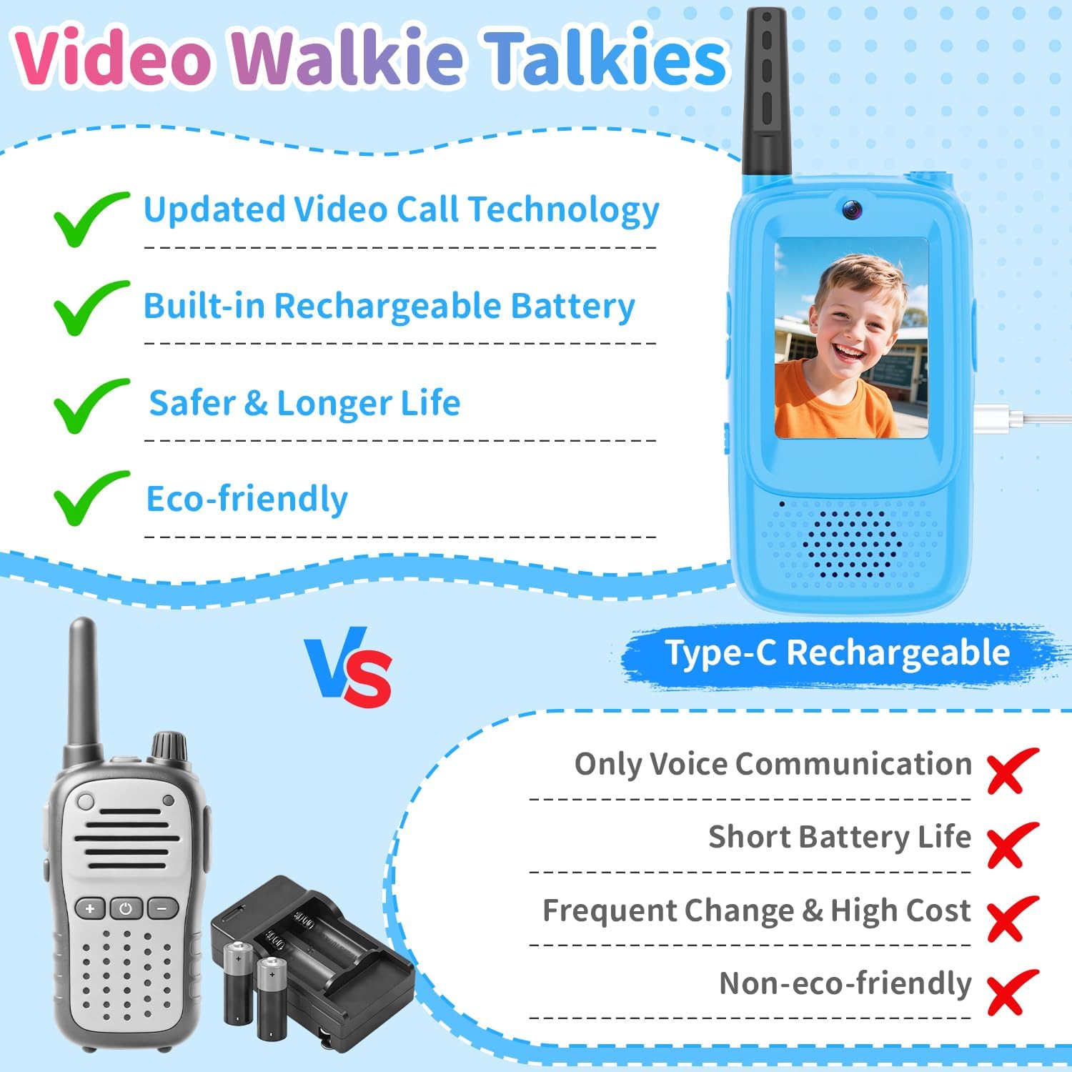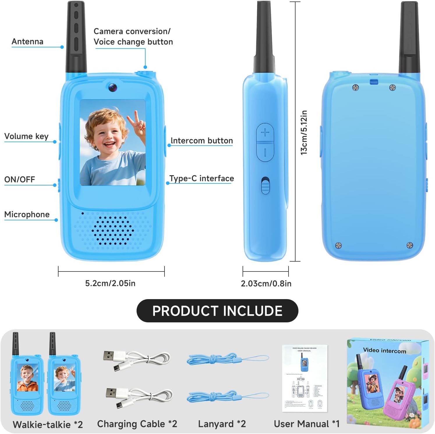 Real-time Video Walkie Talkies: Say goodbye to traditional kids walkie talkies that only transmit voice. Our upgraded kids video walkie talkies features a built-in HD screen and microphone for real-time video calls. The volume is adjustable in six levels. This video walkie talkies is ideal for outdoor play, camping, or park trips.