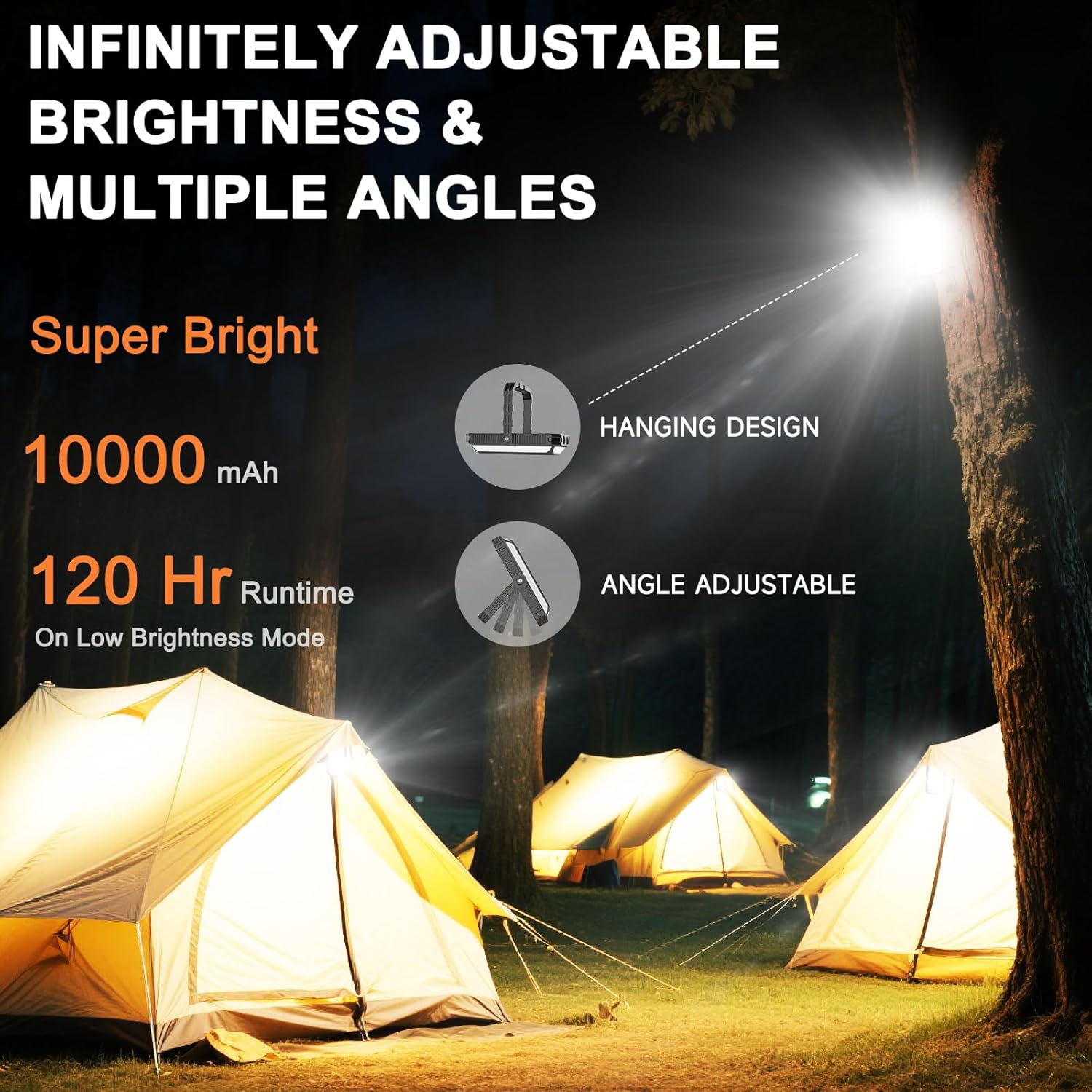 Camping Lights Rainproof & Adventure: Made of high quality ABS material, ensuring a long-time durability and water resistant, heat-resistant, freeze resistant, trouble-free in tough environment.Handles rain, mud, and accidental drops.360° Hooks + Adjustable Stand hang from tents, backpacks, or attach to tripods for perfect lighting angles.