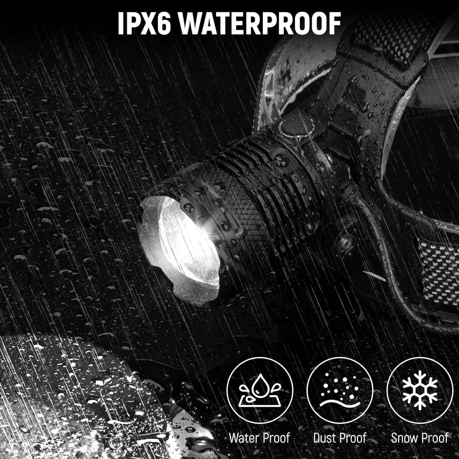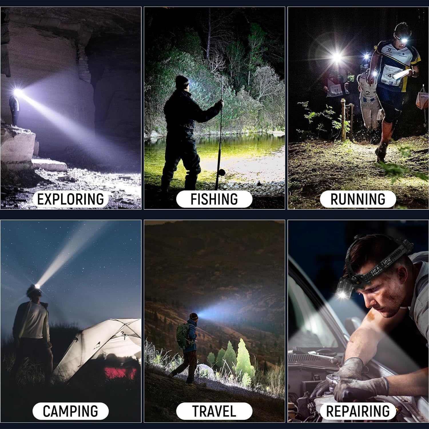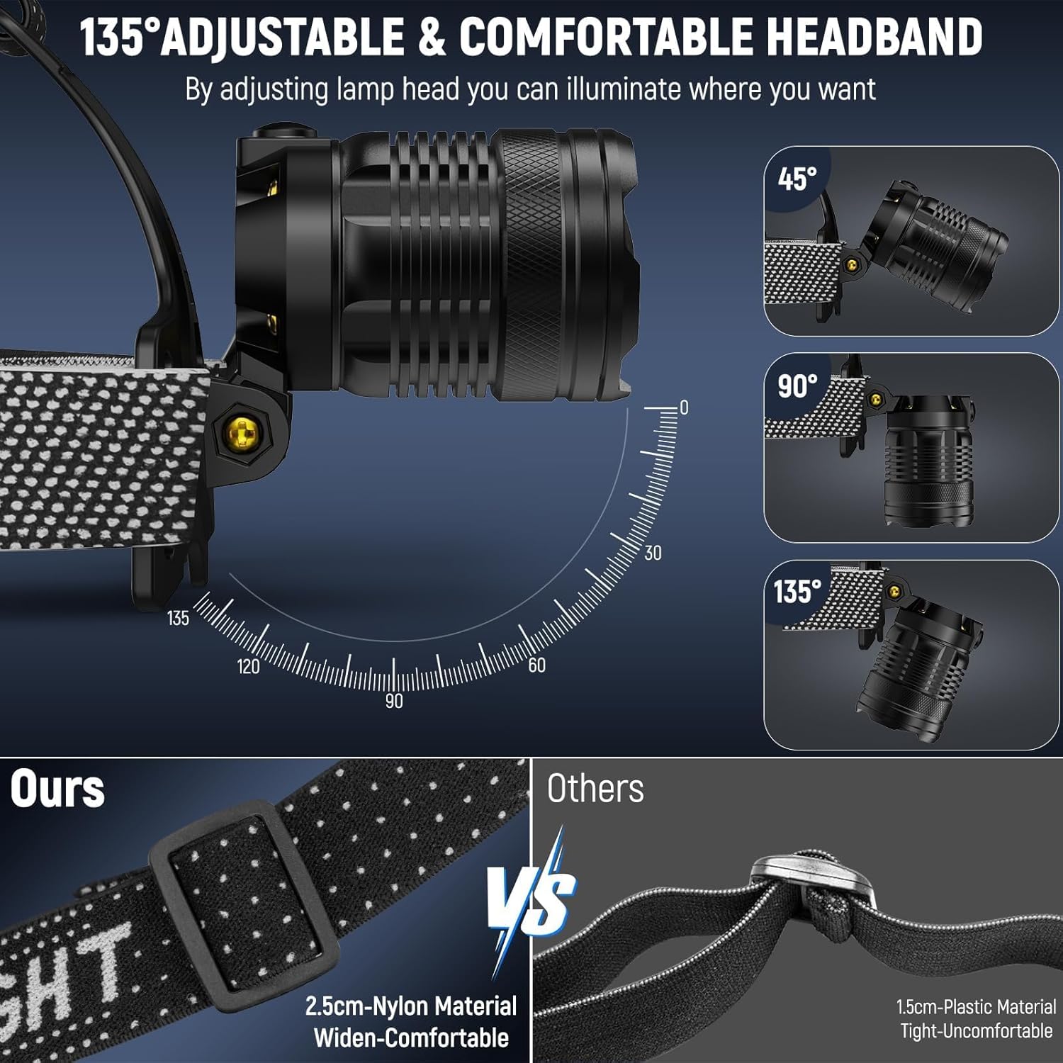 【Waterproof & Comfortable】The IPX6 waterproof feature can effectively prevent water splashes, even in adverse weather conditions like rain and snow. The LED headlamp is equipped with a highly elastic headband that can be adjusted as needed. The widened headband helps reduce pressure and ensures a comfortable experience while wearing the headlamp flashlight.