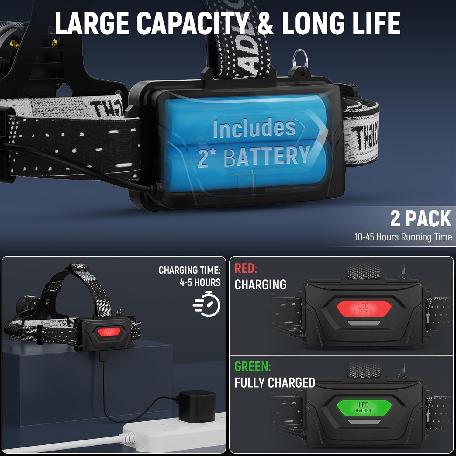 【USB Fast Charge & Long Standby Time】Equipped with a USB charging cable, the head lamp charging takes 4-5 hours. It uses 5500mαh βATTERY (2750mαh*2pcs), making it very lightweight. The high brightness mode lasts about 6-8 hours, while the low light mode can be used for 10-45 hours.