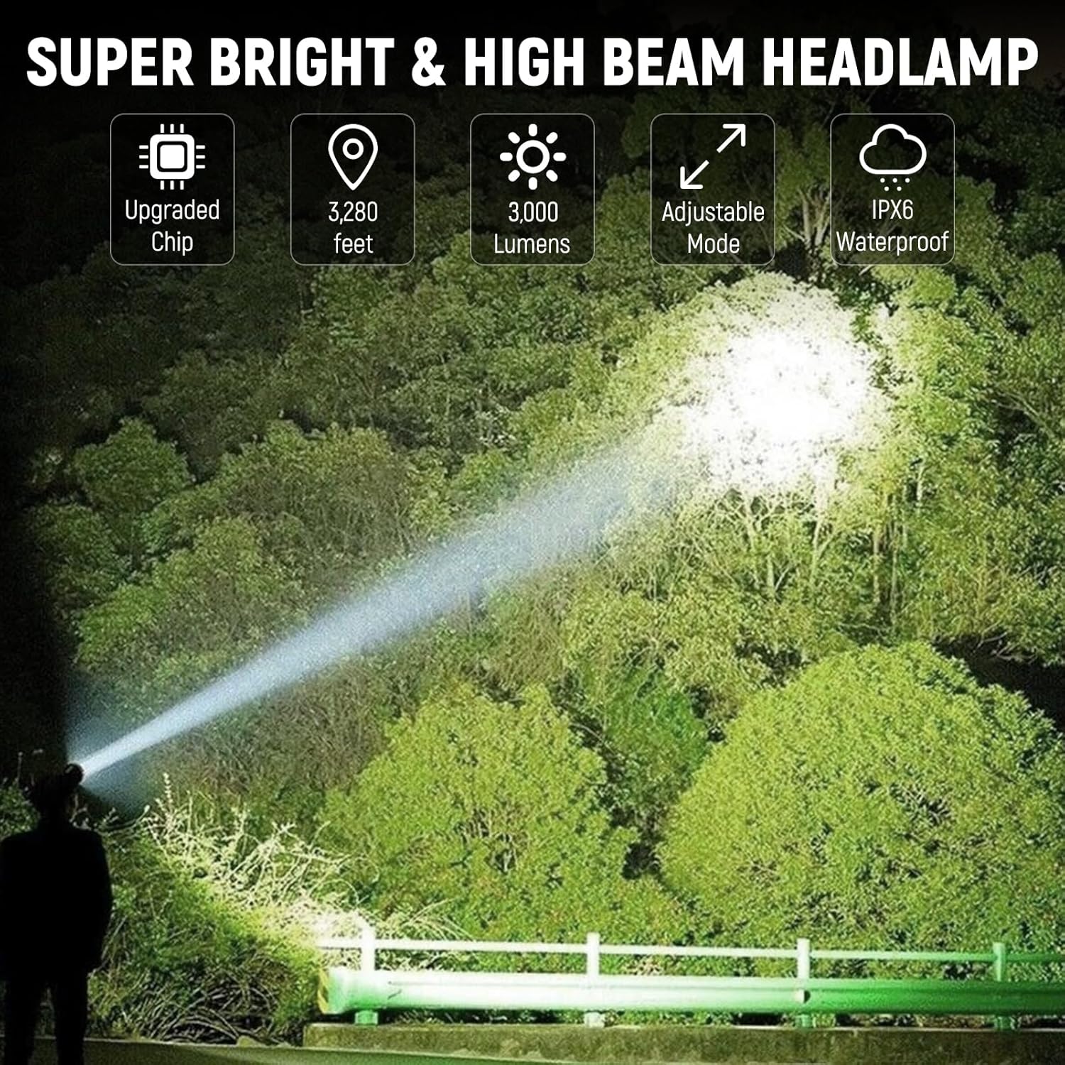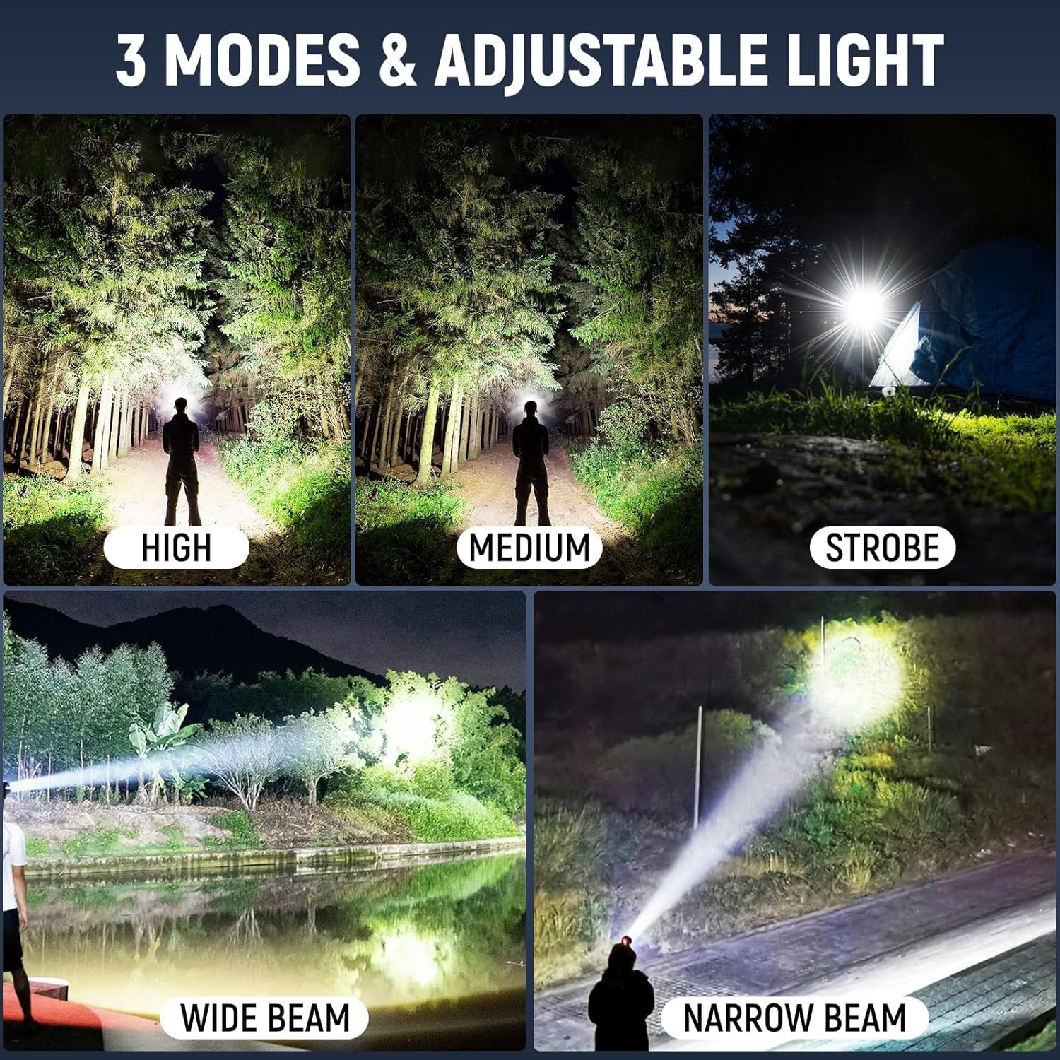 【Super Bright & Long-Lasting】Vinderfine headlamp provides exceptionally bright light. The irradiation distance of up to 3280 feet/1000 meters. The service life can extend up to 10,000+ hours. It offers 3 light modes: high, medium, and strobe.
