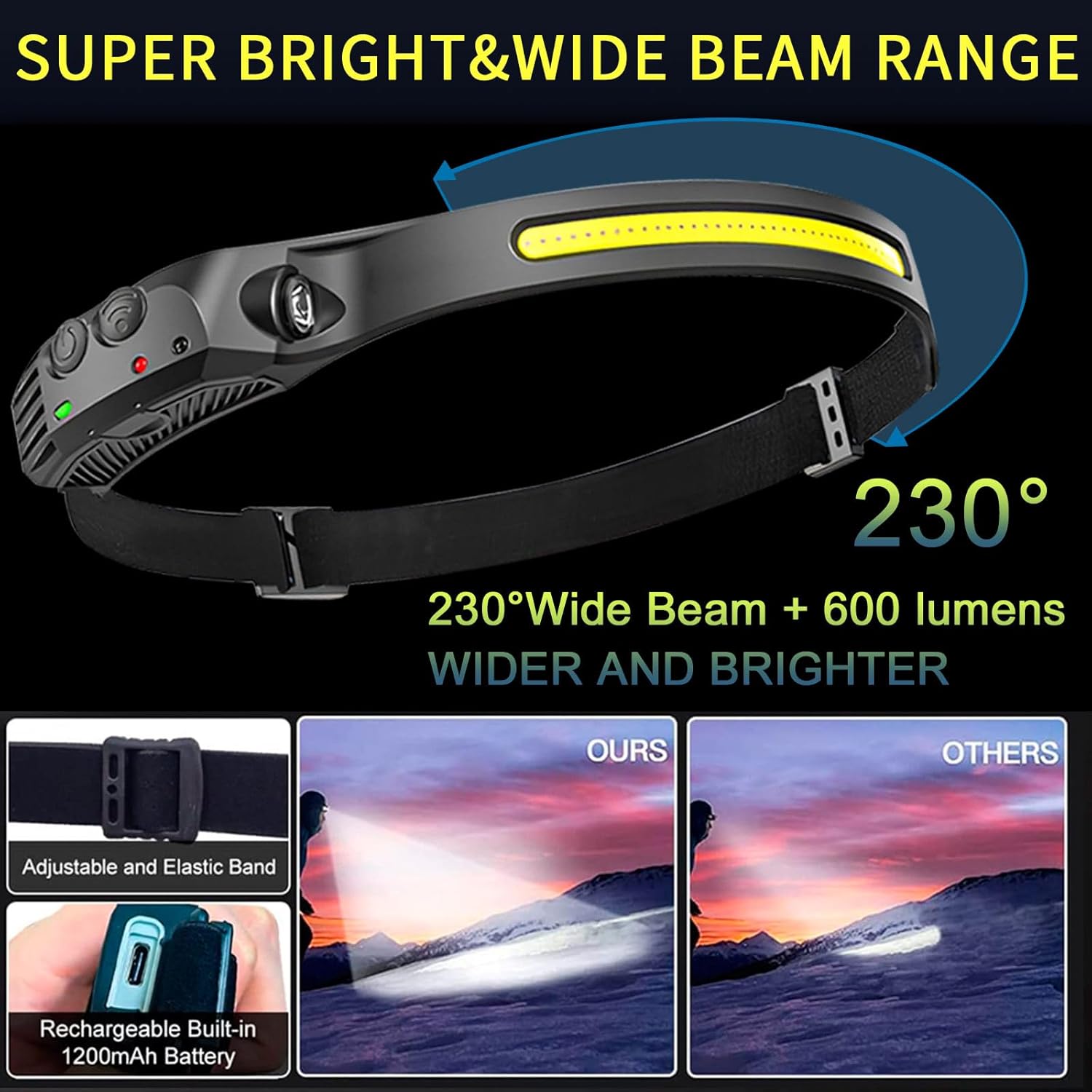 【Ultra Bright with LED Light Strip Design】2025 NEW upgraded 3.0 rechargeable headlamp delivers a 230° wide beam, outperforming standard car headlights in illuminating your surroundings. With an upgraded 1000-lumen LED, it provides a spotlight beam distance of up to 150 meters. This powerful lighting solution ensures you can confidently navigate the dark and instantly brighten your environment