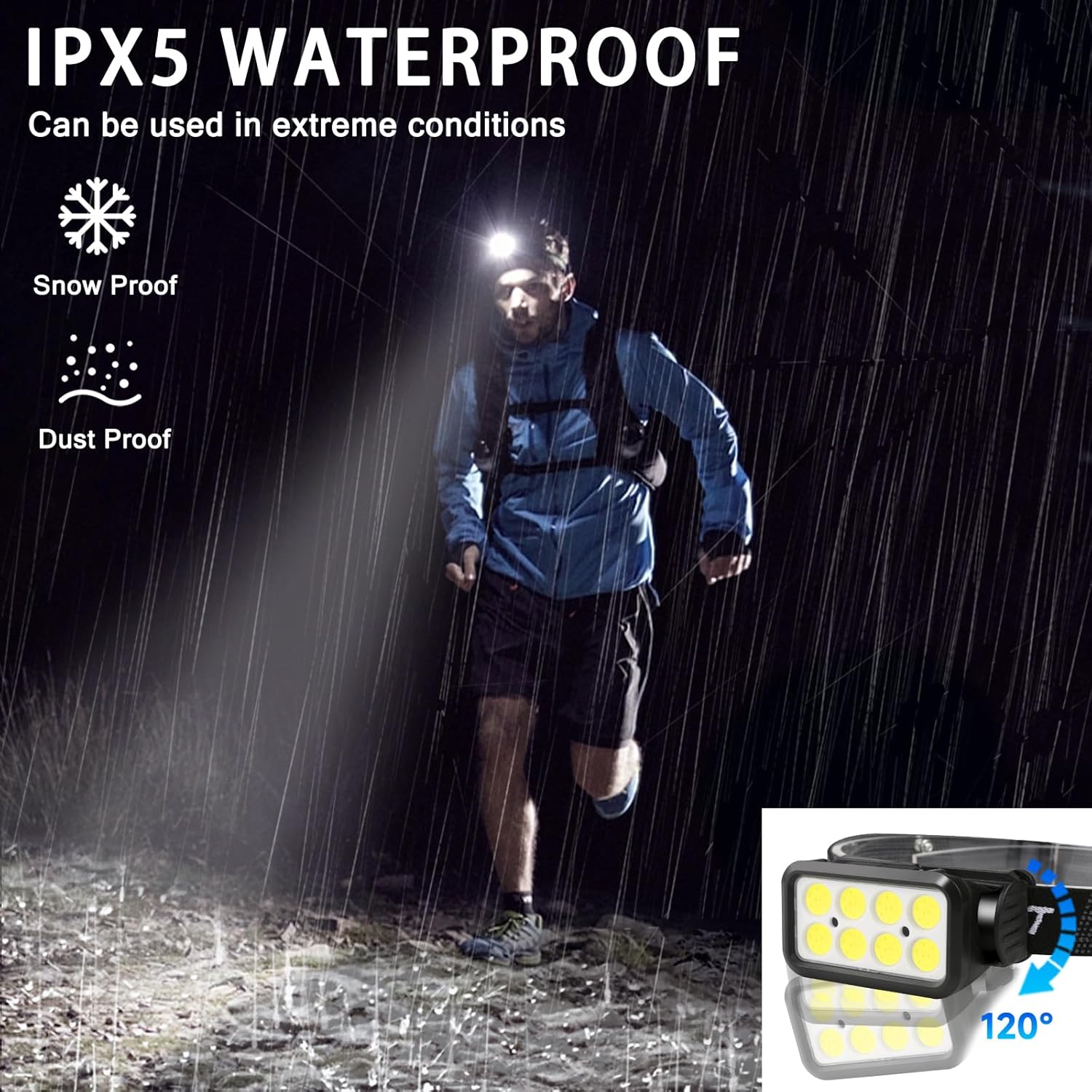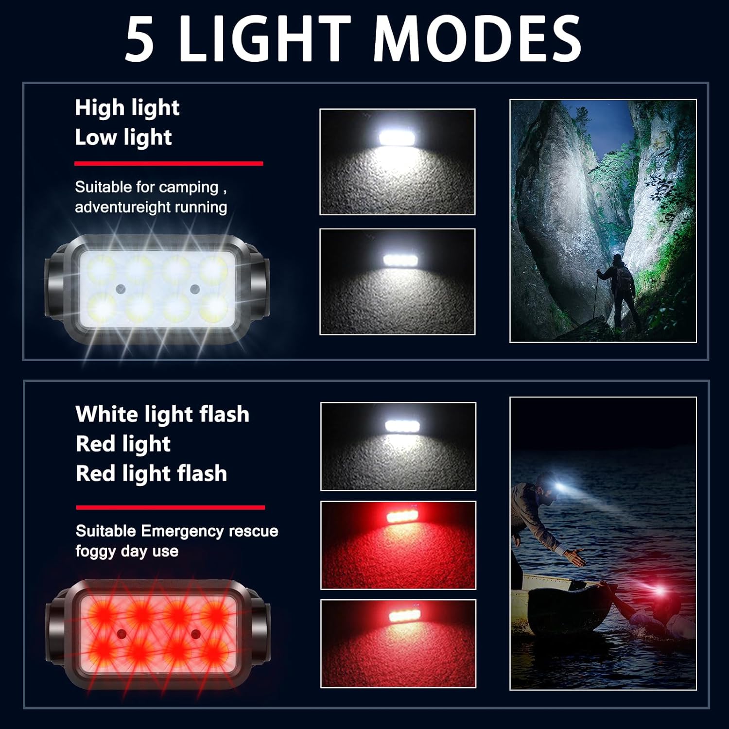 Super Bright: Headlamp Rechargeable features 8 XPE LED spotlight and COB LED floodlight, supplying 300 lumens brightness, which is a perfect lighting solution for outdoor activities. Whether you’re camping, hiking, running, or cycling, our headlamp ensures that you can see clearly even in the darkest environments.