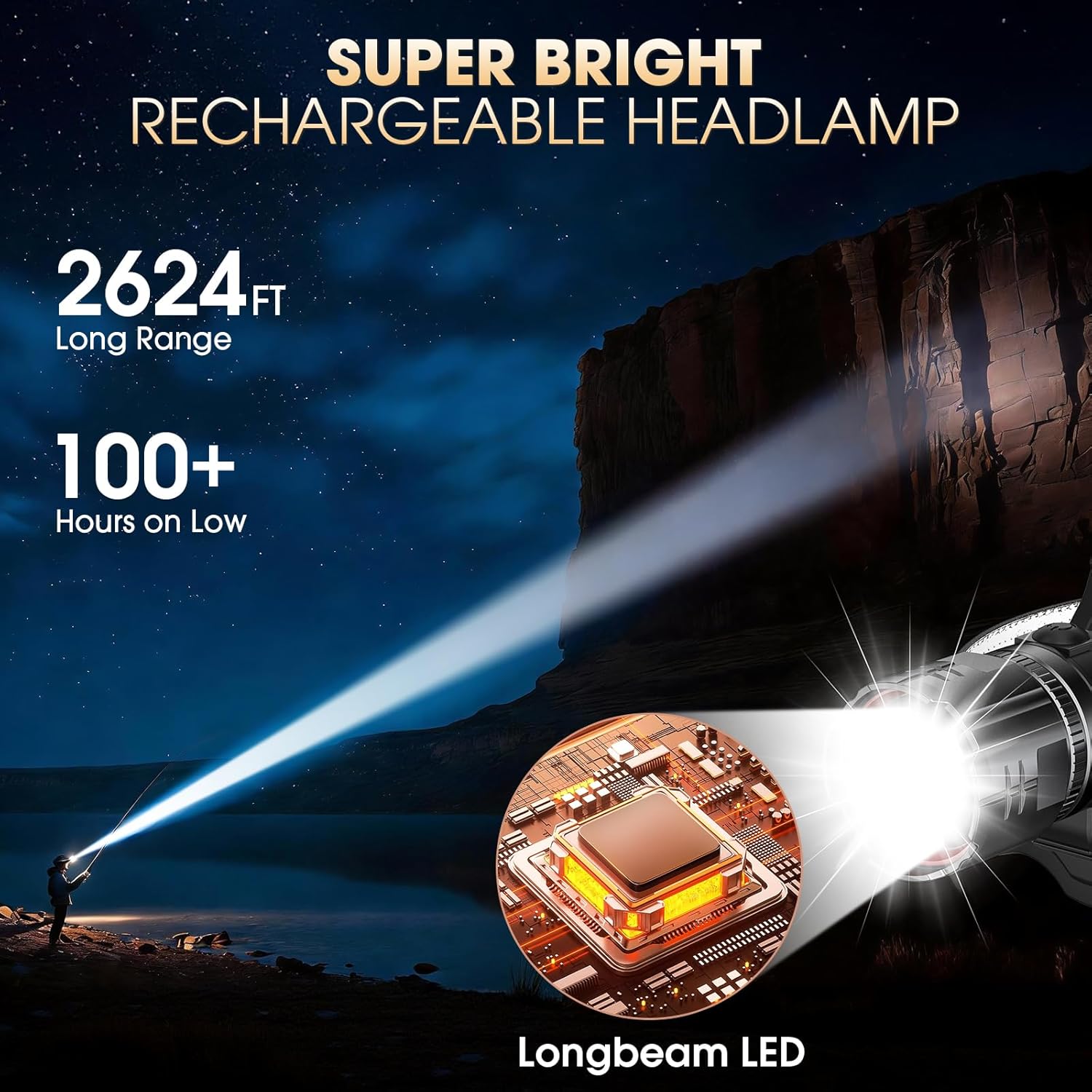 【Fast Charging and Long Battery Life】The rechargeable headlamp is equipped with a 2A fast TYPE-C cable, which charges very quickly. If you use an adapter with a rated current of 2A, it only takes 3.5-4 hours to fully charge. The battery capacity of this headlamp is 6000 mAh, which can work for 10 hours in high light mode and 100 hours in low light. It can also be used as a mobile power bank to charge your mobile phone when you encounter an emergency.