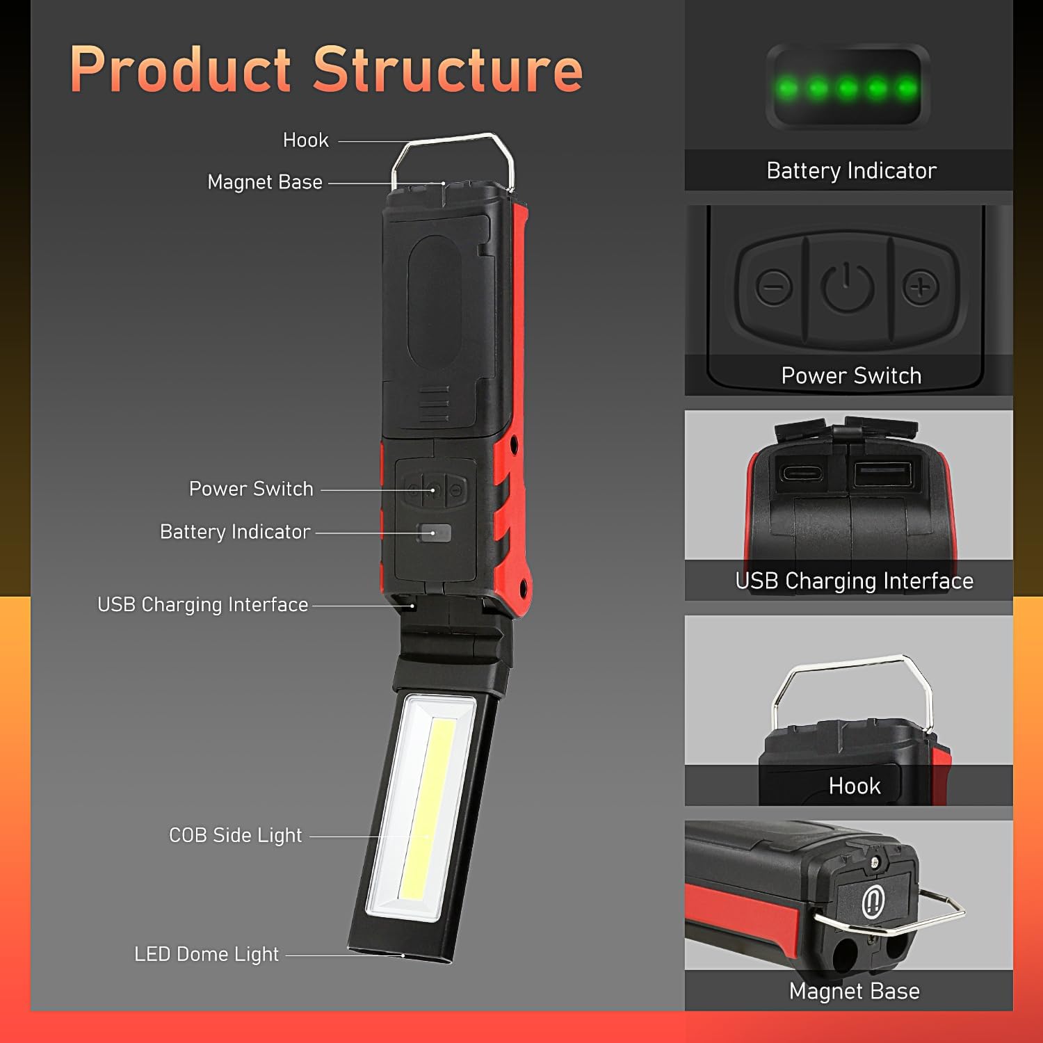 【ABS Material】 Our LED work light is made of hard rubber and ABS plastic, anti-sweat and anti-slip, water resistant. It can be folded into a compact size, easy to carry and save storage space. The rechargeable work light is suitable for home lighting, power outage, emergency, car repairing, mechanics, etc.