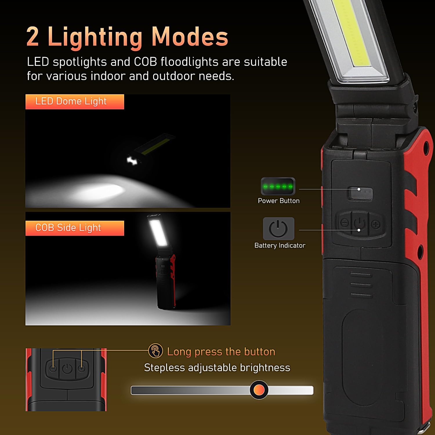 【Adjustable Brightness & 2 Working Modes】 The bright led work light has 2 lighting modes: Head spotlight and side COB light, long press the “-” switch to weaken the light and long press the “+” switch to enhance the light.