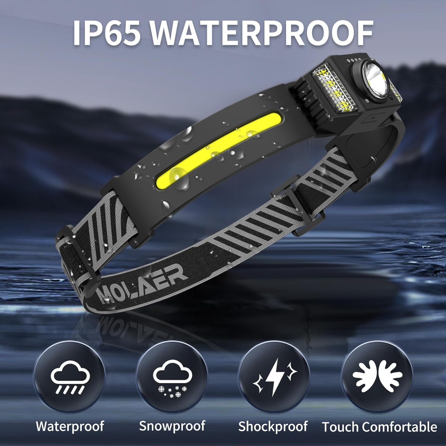 【Long Press Function and Motion Sensor】 The head lamp has added a long press function. In any mode, if you hold the key mode button for 2 seconds, you can turn off the light directly. LED headlamp camping accessories is equipped with the latest intelligent sensors, press the sensor switch button in any light mode you can easily turn the lights ON/OFF by waving your hand, which is more convenient and avoids soiling the headlamp when your hands are dirty.