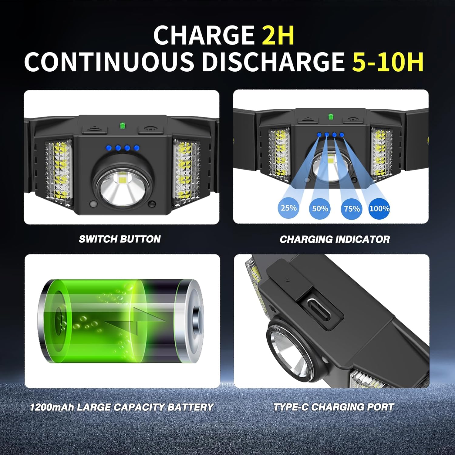 【USB-C Charging】 Built-in 1200mAh rechargeable lithium battery and Type-C USB input port, the headlamp can be charged via computers, car chargers and power banks, etc. The battery indicator light lets you know the remaining power in real time.