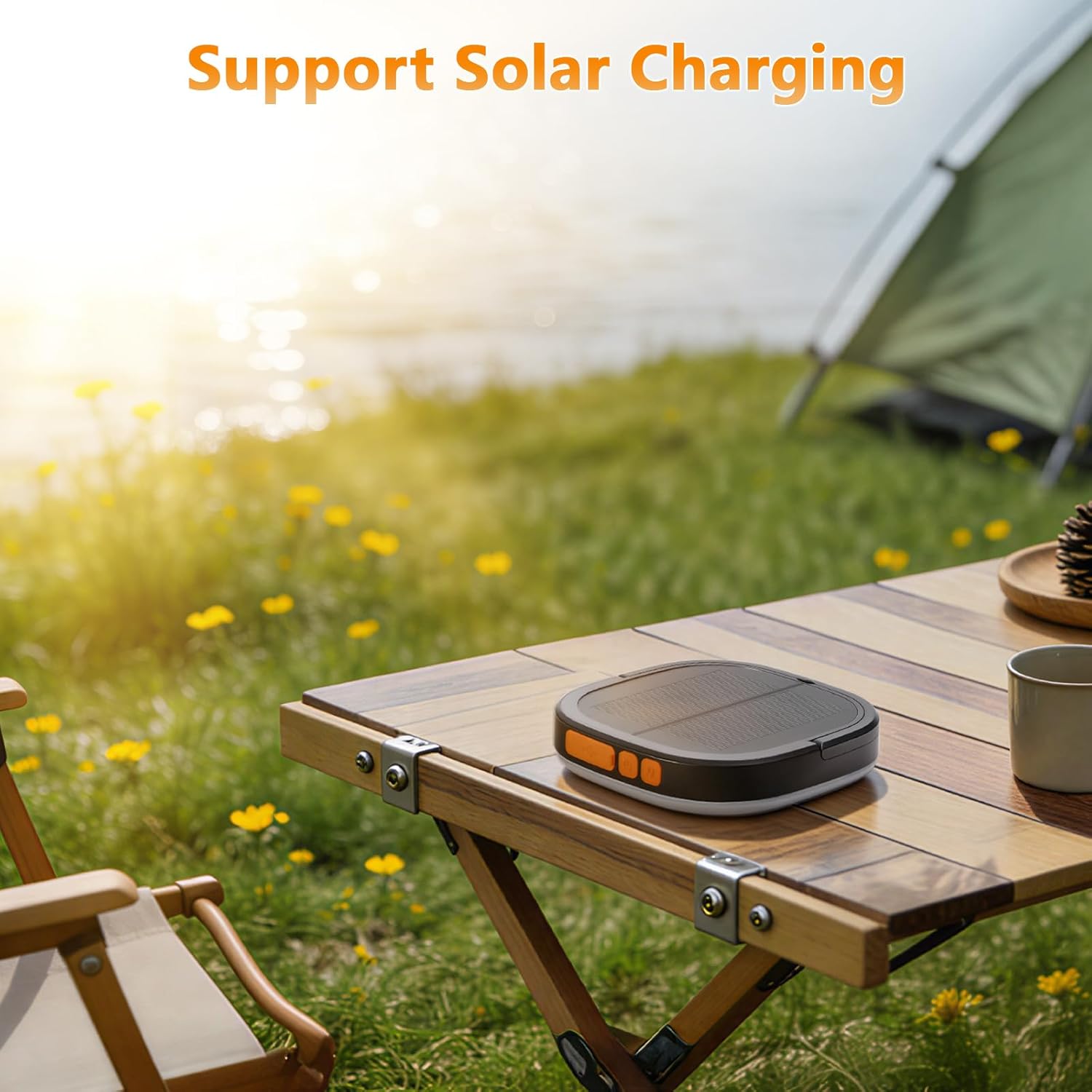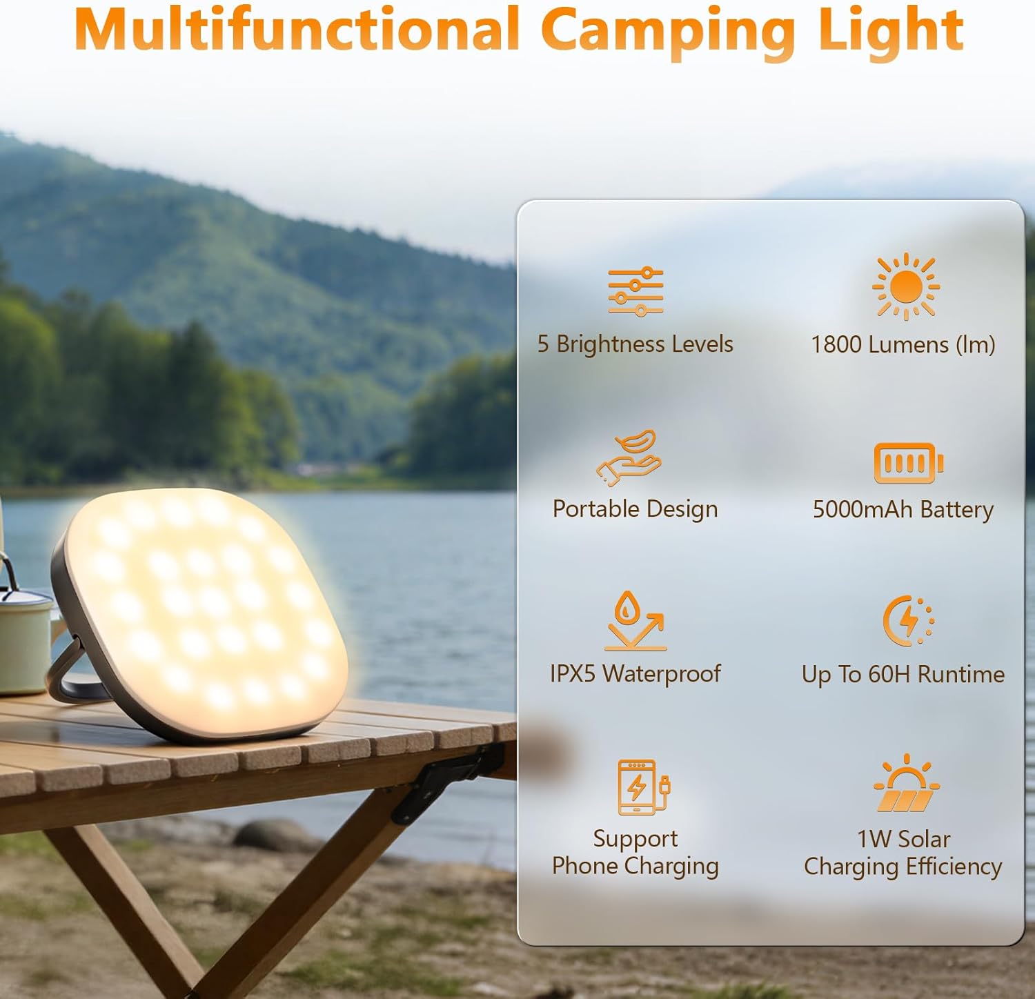 【Smart Dual-Power System】 This camping lantern integrates a 5000mAh polymer battery with USB fast charging (3.85V/19.25Wh) replenishing 20% daily in sunlight for multi-day outdoor use. Monitor energy via the 4-level power indicator and utilize it as an emergency phone charger.