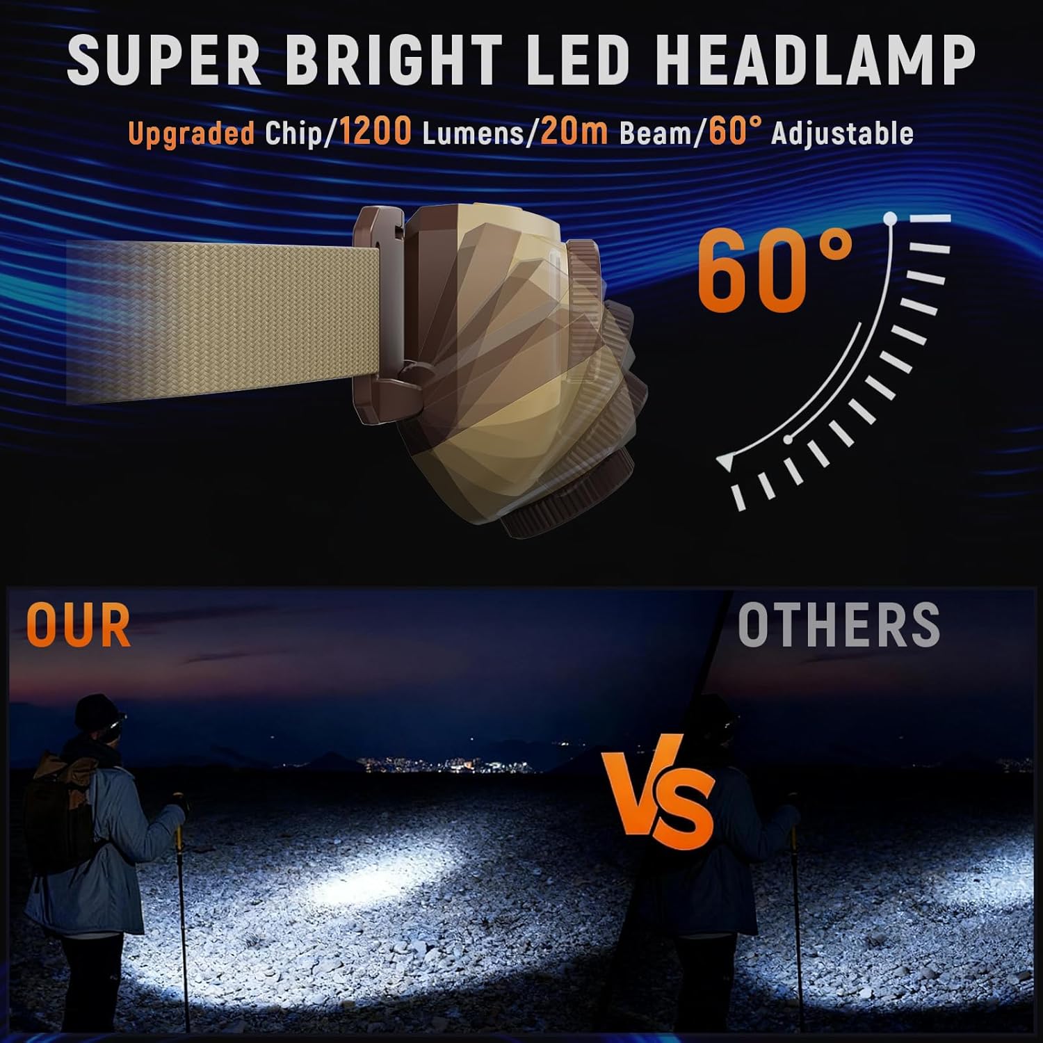Super Bright Headlamp: With 1200 high lumens, this headlamp adopts first-class LED chips and 3 powerful LED bulbs, more brighter than ordinary led headlamp and has a wider illumination range. The 60-degree adjustable beam lets you aim the light exactly where needed.