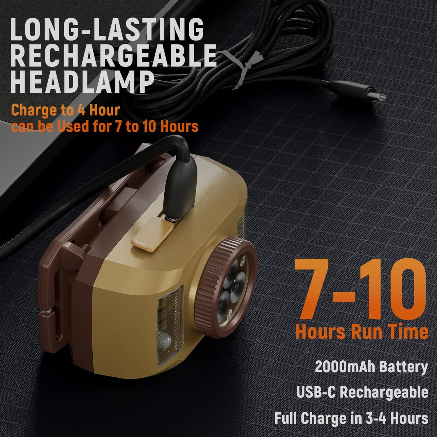 Long-Lasting Rechargeable Headlamp: This camping headlamp flashlight features a built-in 2000mAh high-capacity battery, delivering 7-10 hours of runtime for extended outdoor use. A full charge takes only 3-4 hours with the included USB-C cable.