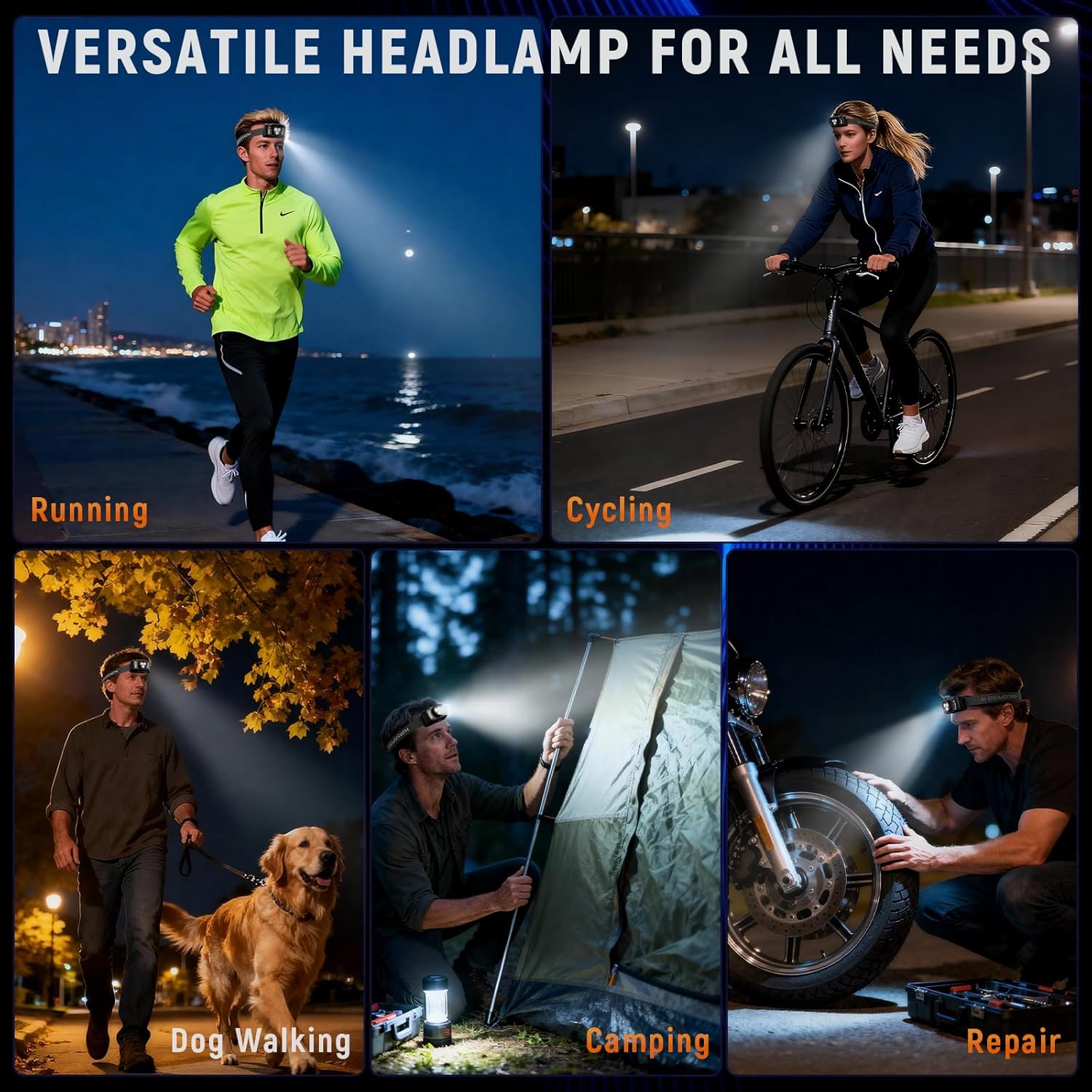 Versatile Rechargeable Headlamp: Engineered for peak performance from indoor settings to demanding outdoors, it serves as the ideal lighting tool for camping, hiking, dog walking, fishing, cycling, DIY projects, exploration, reading, vehicle maintenance, and emergency.