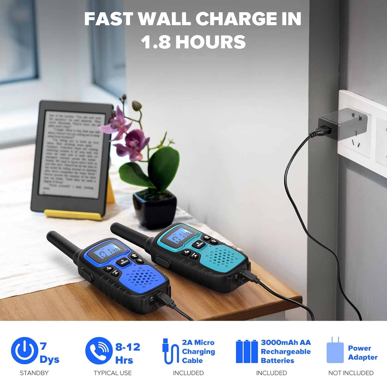 UNLIMITED COMMUNICATION TIME — The rechargeable walkie talkie supports micro USB charging. You can charge them indoors, on the road, and even camping and hiking, and you do not need to pay for batteries, again and again, saving stress and money for you.