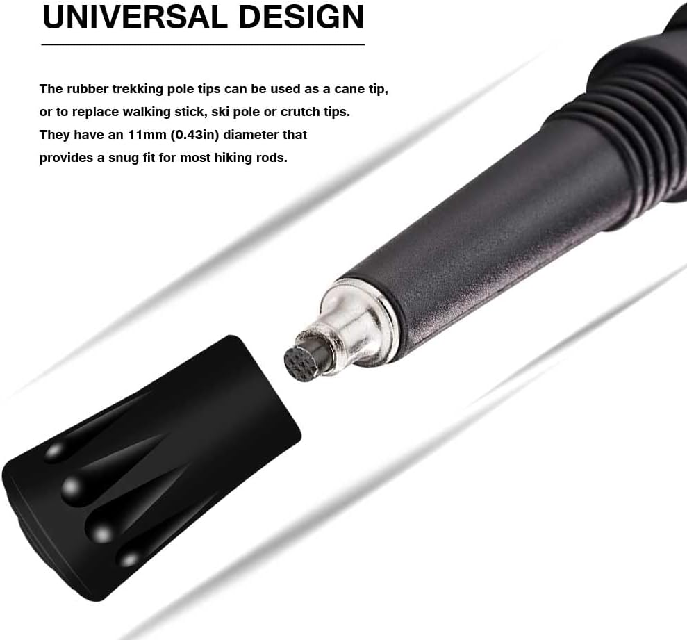 ✔ | UNIVERSAL DESIGN | – The rubber trekking pole tips can be used as a cane tip, or to replace walking stick, ski pole or crutch tips. They have an 11mm (0.43in) diameter that provides a snug fit for most hiking rods.