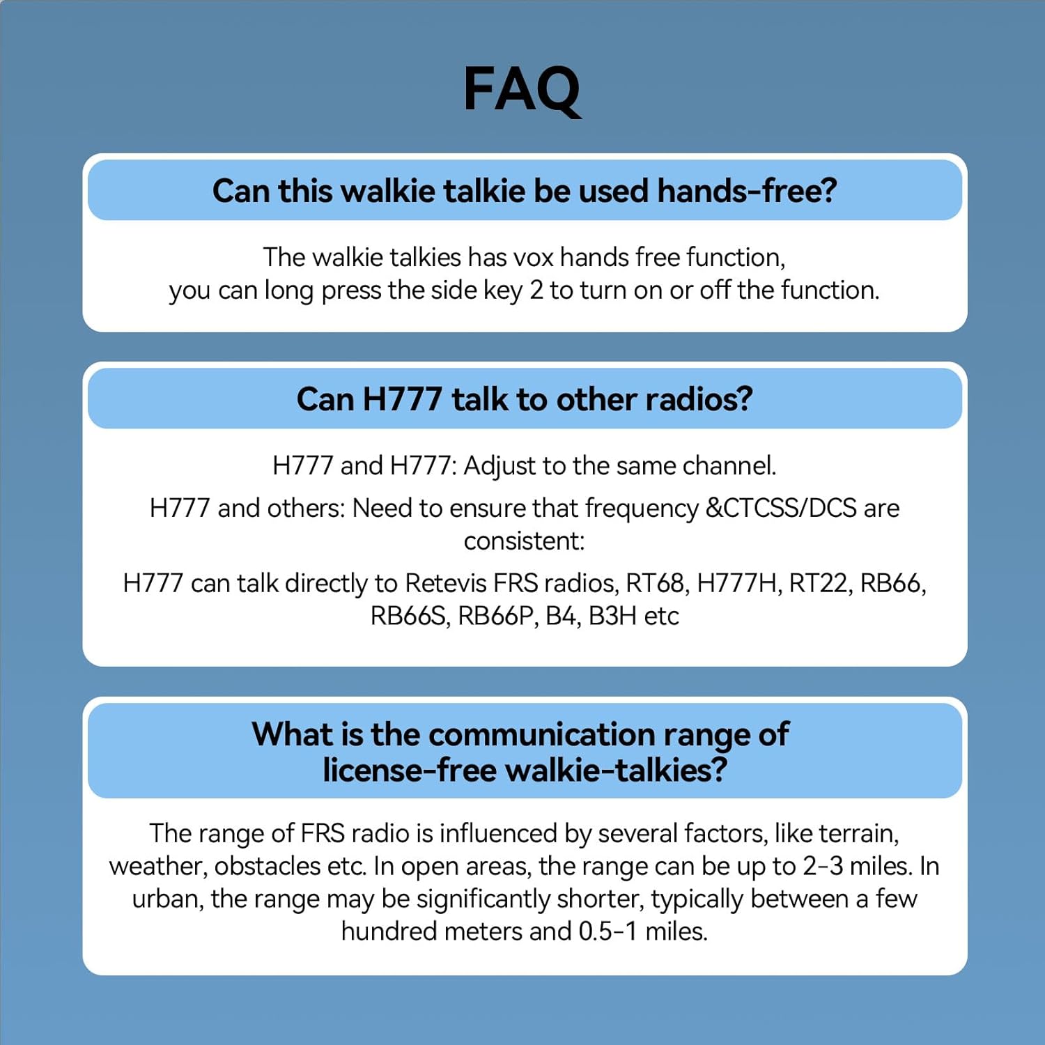 Crystal-clear communication; H777 two way radio features squelch function and adjustable volume; reducing background interference for sharp audio; making your outdoor adventures more enjoyable